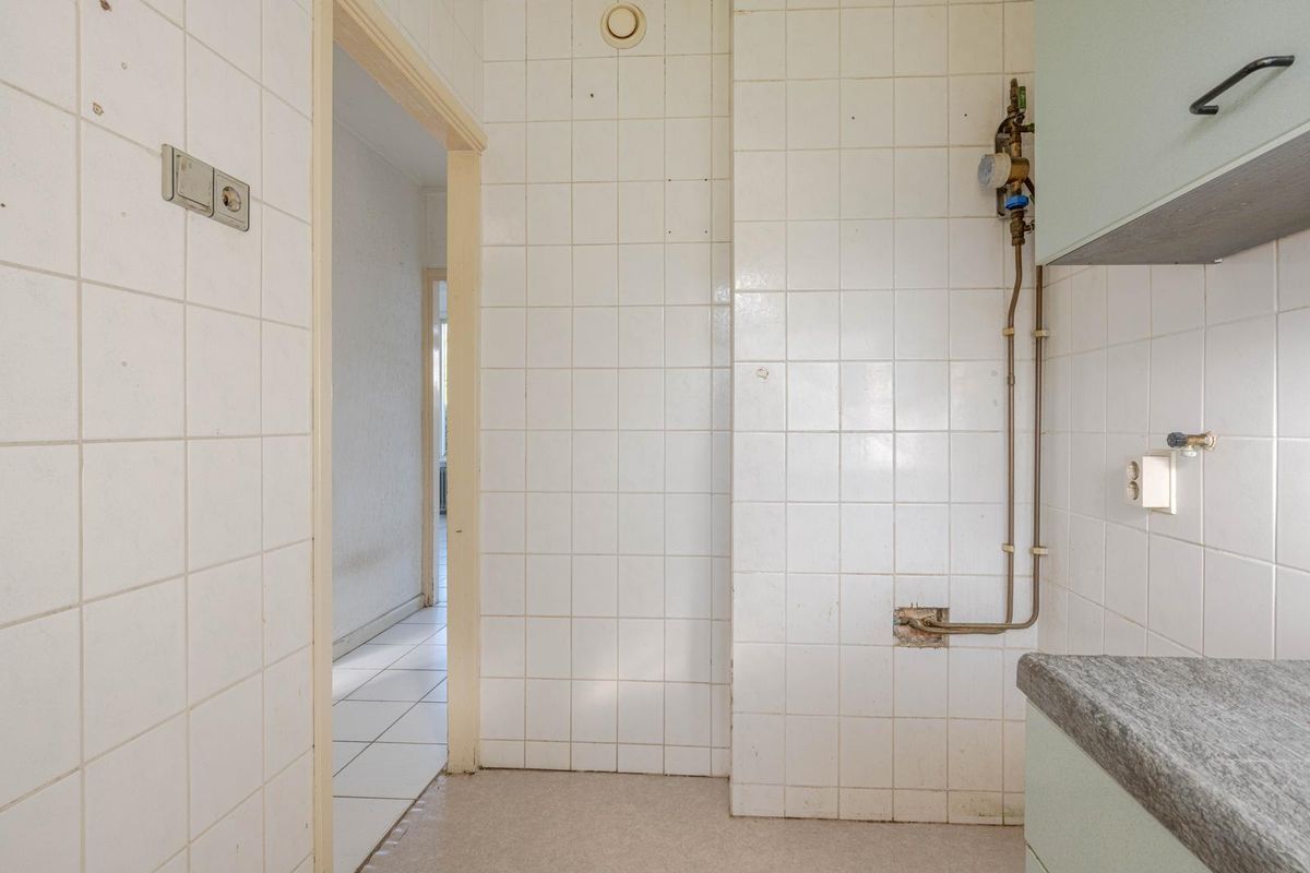 * Keuken voorzien van vinylvloer, gestuukte wanden en plafond en kunststof keukenblok met de opstelling van de geiser.