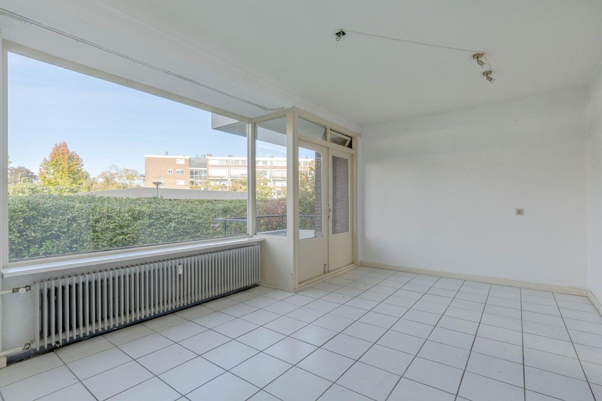 * Royale, lichte woonkamer voorzien van tegelvloer, gestuukte wanden en plafond en middels openslaande deuren toegang tot het balkon.