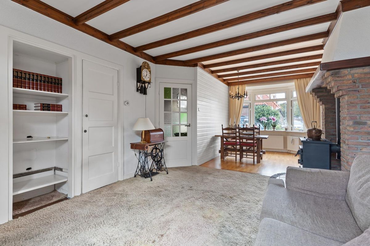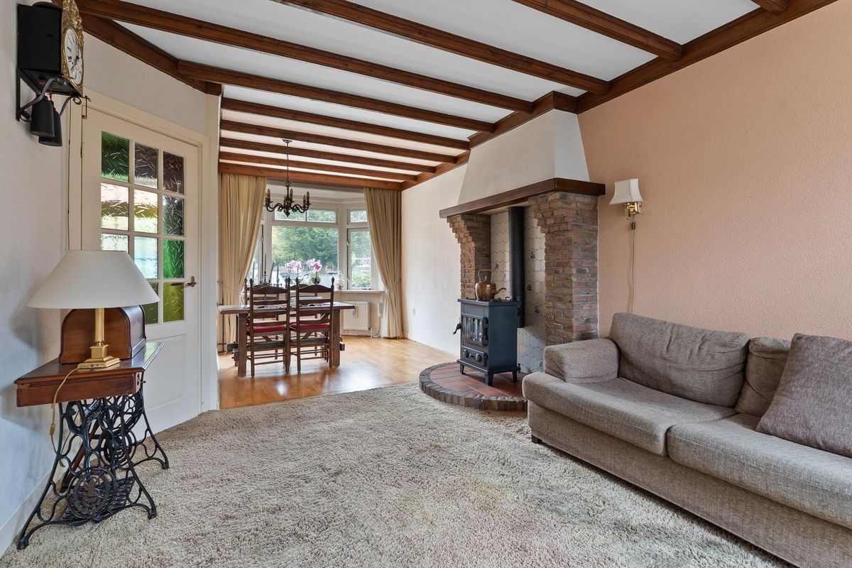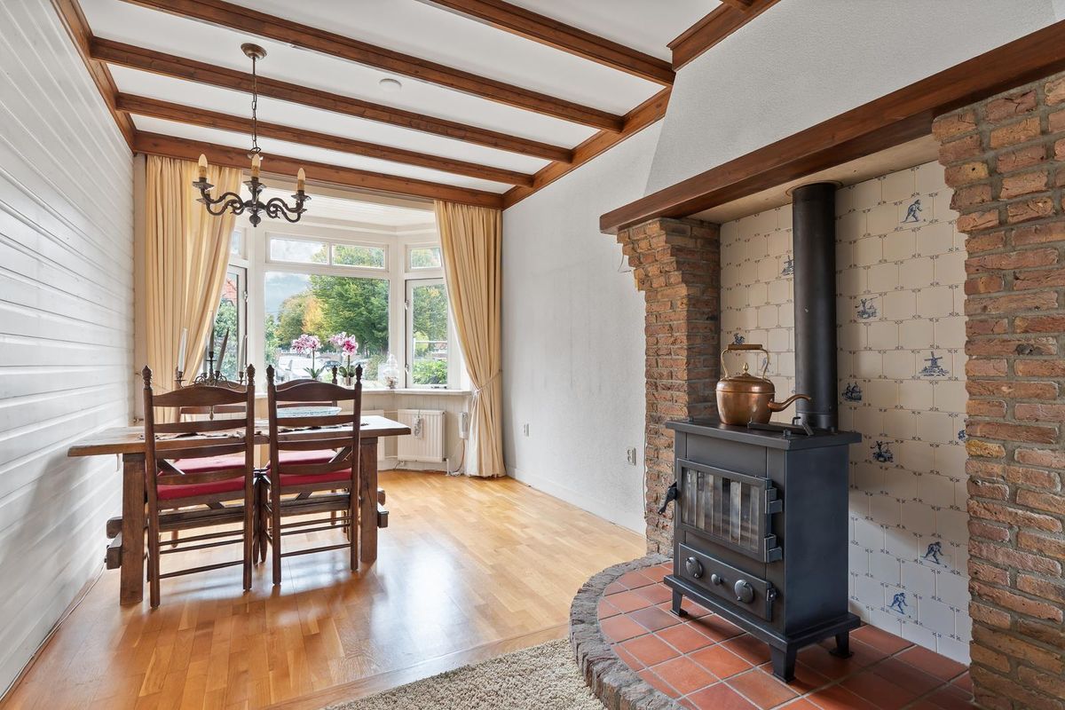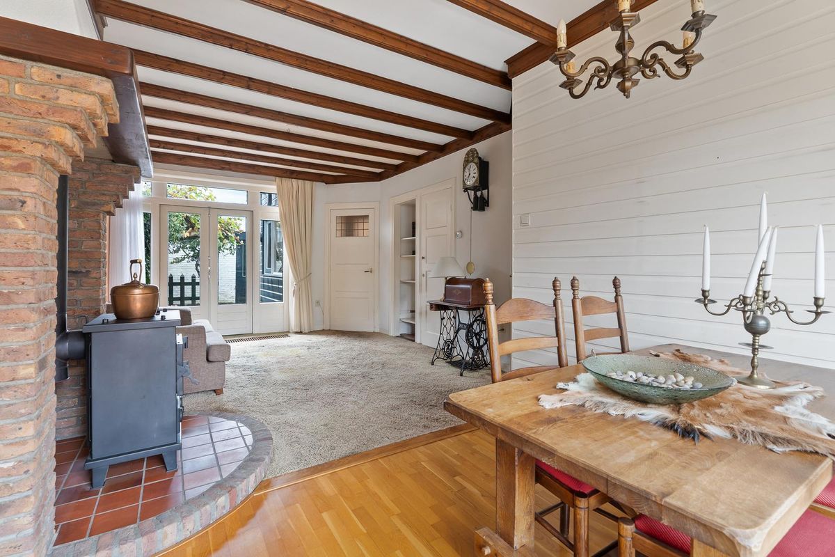De lichte woonkamer heeft een gezellige zithoek met een sfeervolle houtkachel en openslaande deuren naar de achtertuin. Aan de voorzijde bevindt zich het eetgedeelte met parketvloer, een fijne plek voor lange avonden met familie of vrienden. Onder de trap bevindt zich een trapkast met groepenkast, tevens handig voor extra bergruimte.