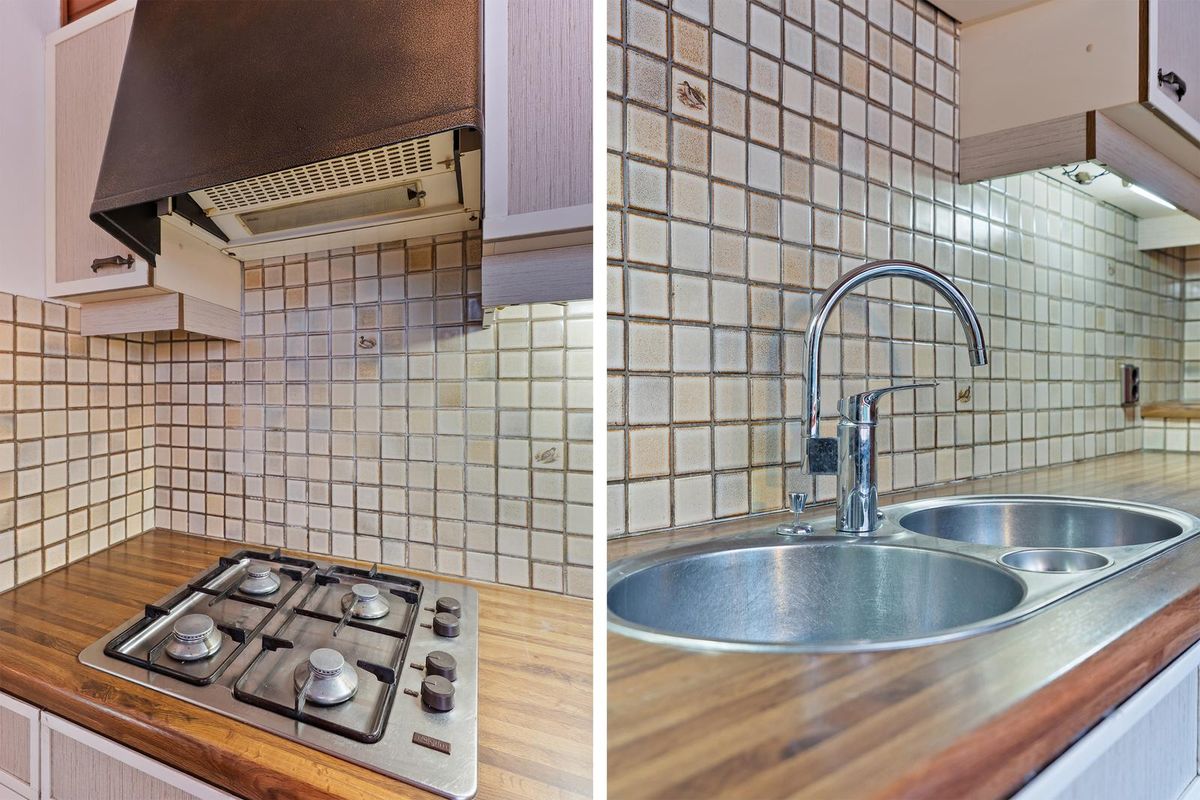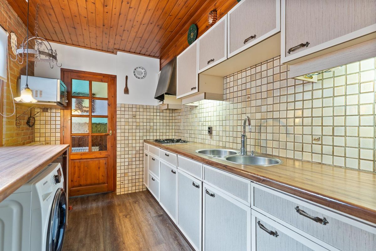 De dichte keuken is uitgevoerd met een nette kastopstelling, gaskookplaat, afzuigkap en aansluiting voor de wasmachine. Aan de achterzijde bevindt zich het toilet.