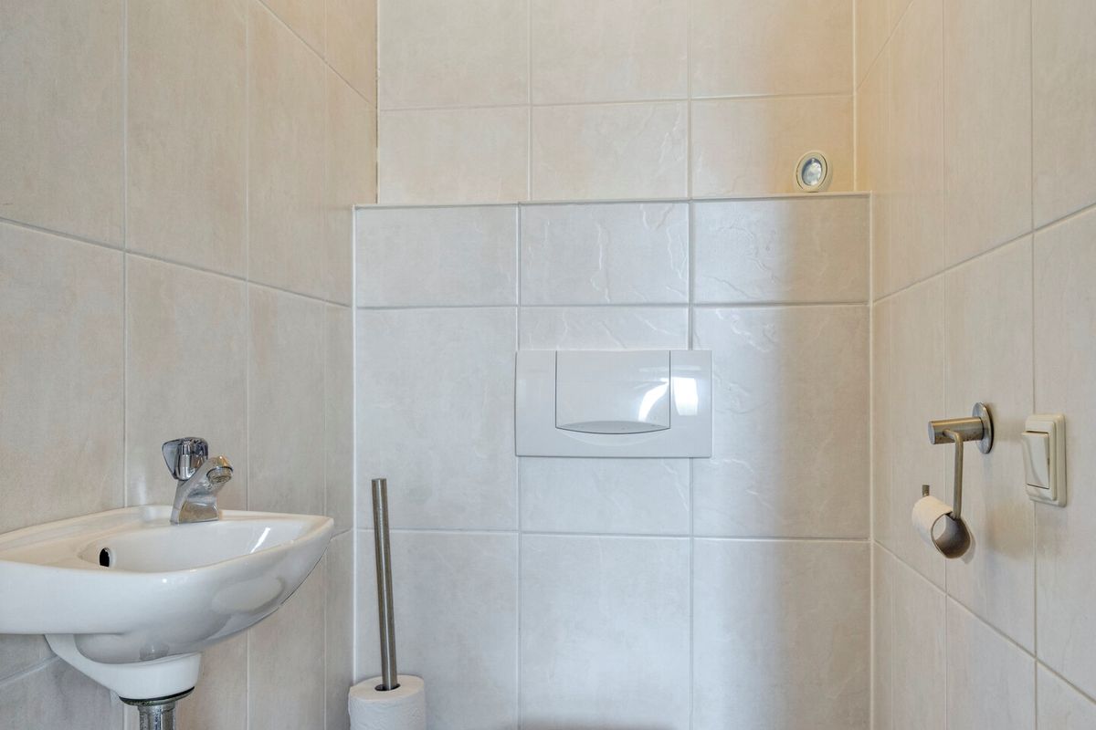 Daar stap je de hal binnen. In de hal vind je de meterkast, garderobe en een toiletruimte met hangend toilet en fonteintje.