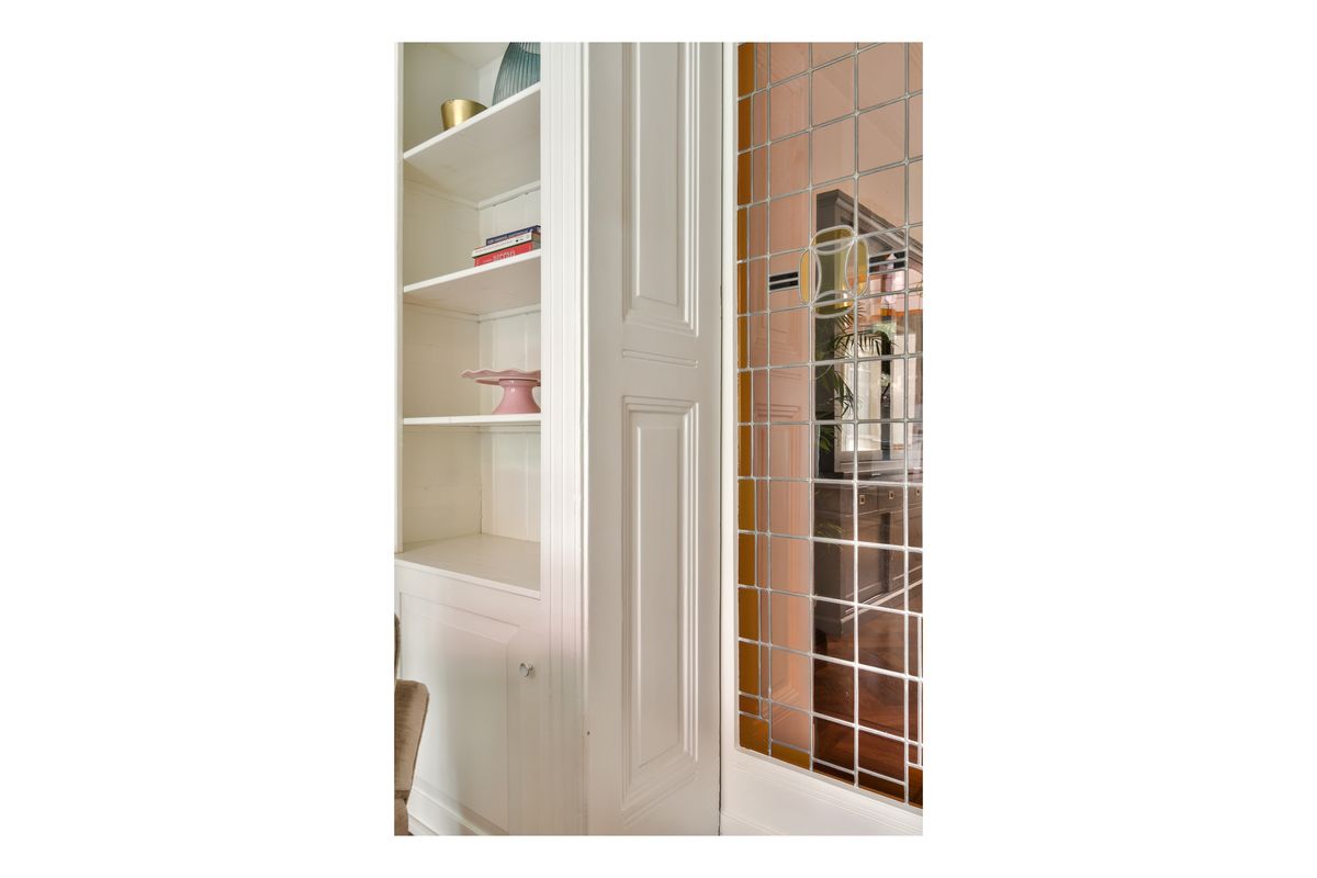 The classic living room en suite features high ceilings (3.31 m), stained-glass sliding doors, marble fireplaces, built-in cupboards and French doors opening onto the garden.