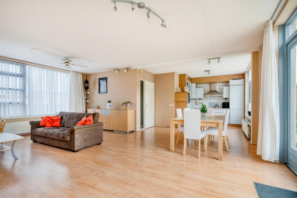 De woonkamer van ca. 53,4 m² is een lichte en ruime plek met verschillende mogelijkheden voor de indeling. Door de brede ramen en dubbele tuindeuren komt er veel daglicht binnen.