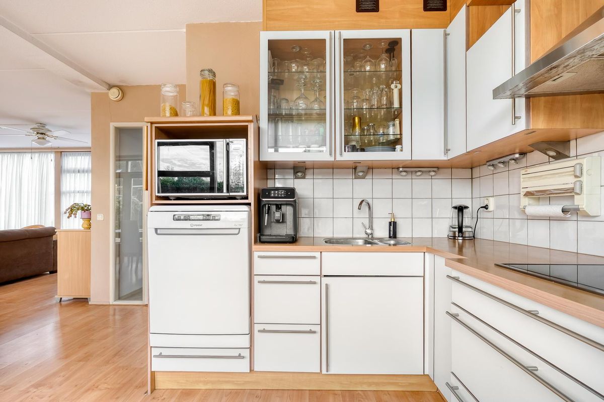 De keuken is praktisch ingedeeld en voorzien van een kookplaat (2025) en koelkast/diepvriescombinatie. De bijkeuken is handig voor extra opslag of als plek voor bijvoorbeeld een extra koelkast of wasruimte.