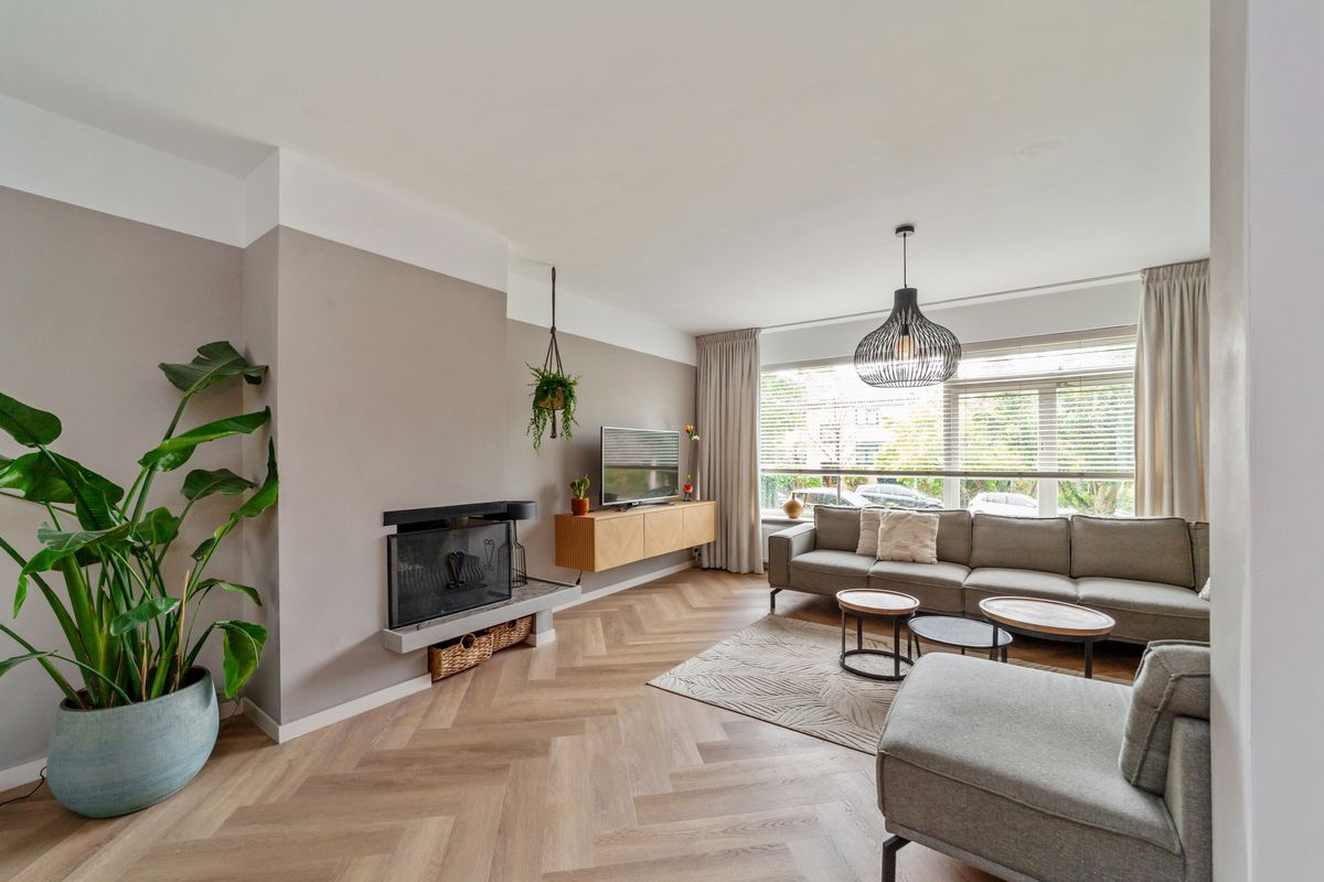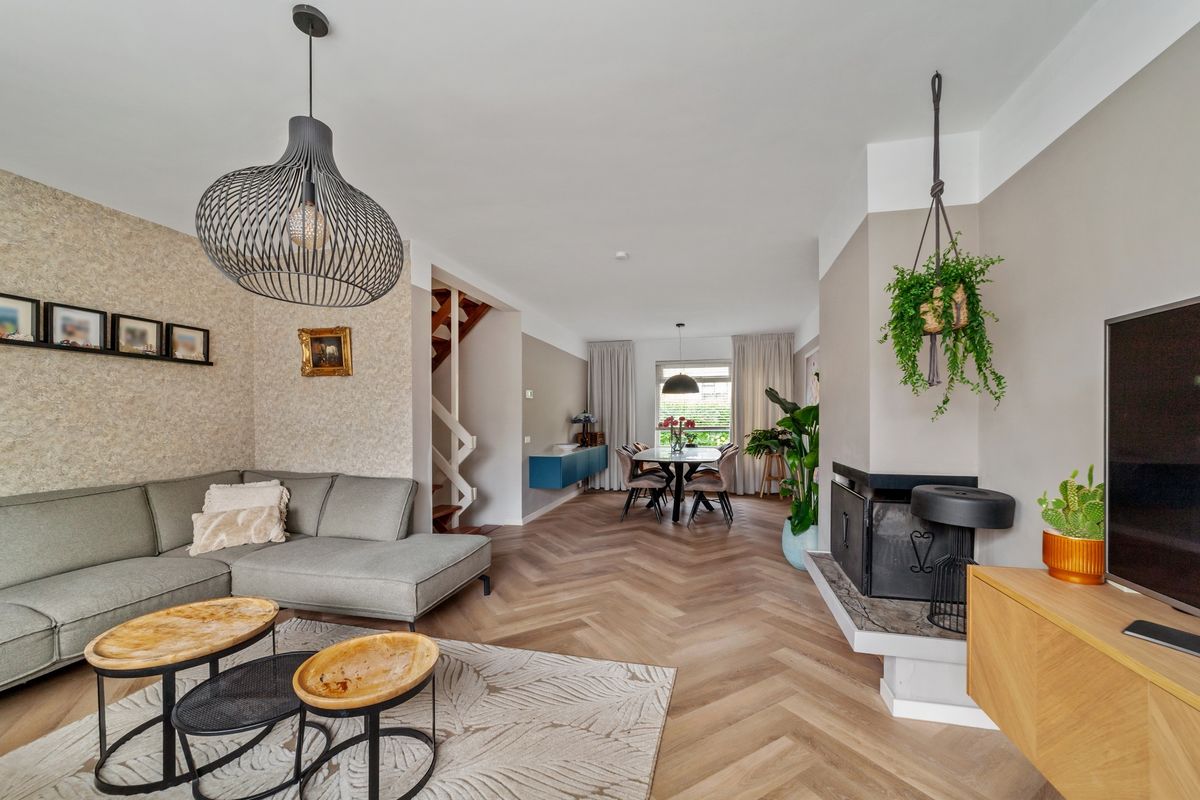 Enkele treden hoger bevindt zich de ruime woon- eetkamer met prachtige PVC visgraat vloer en open haard.