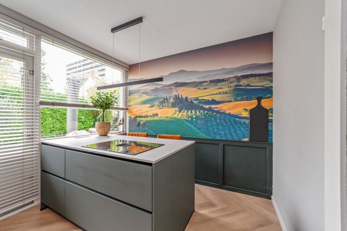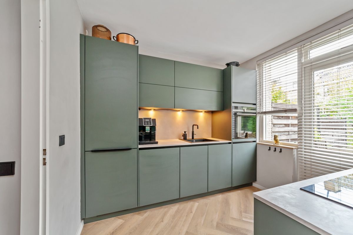 Voortuin, entree, hal, hangend toilet met fontein, gang met provisiekast/bergruimte, ruime (woon)keuken met kookeiland een inductiekookplaat inclusief ingebouwde afzuiging, koel-vriescombinatie, vaatwasser en oven. Visgraat PVC vloer.