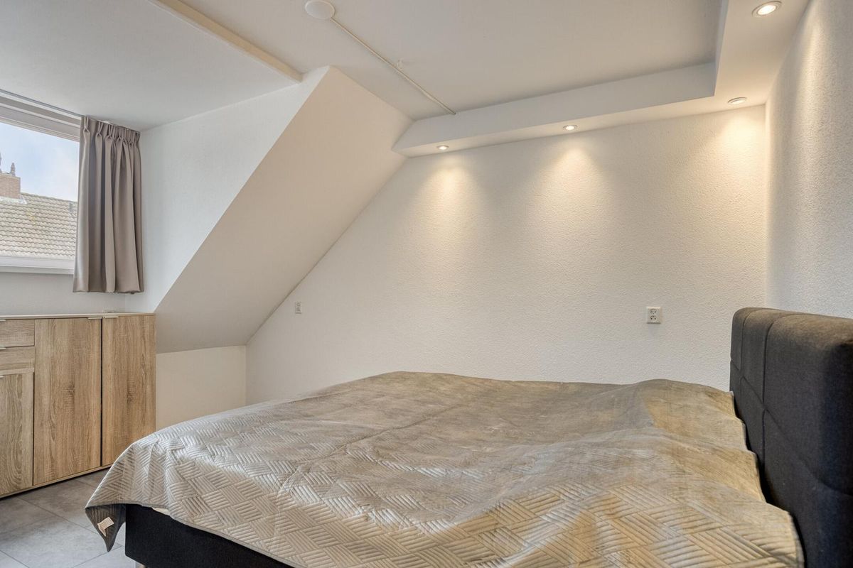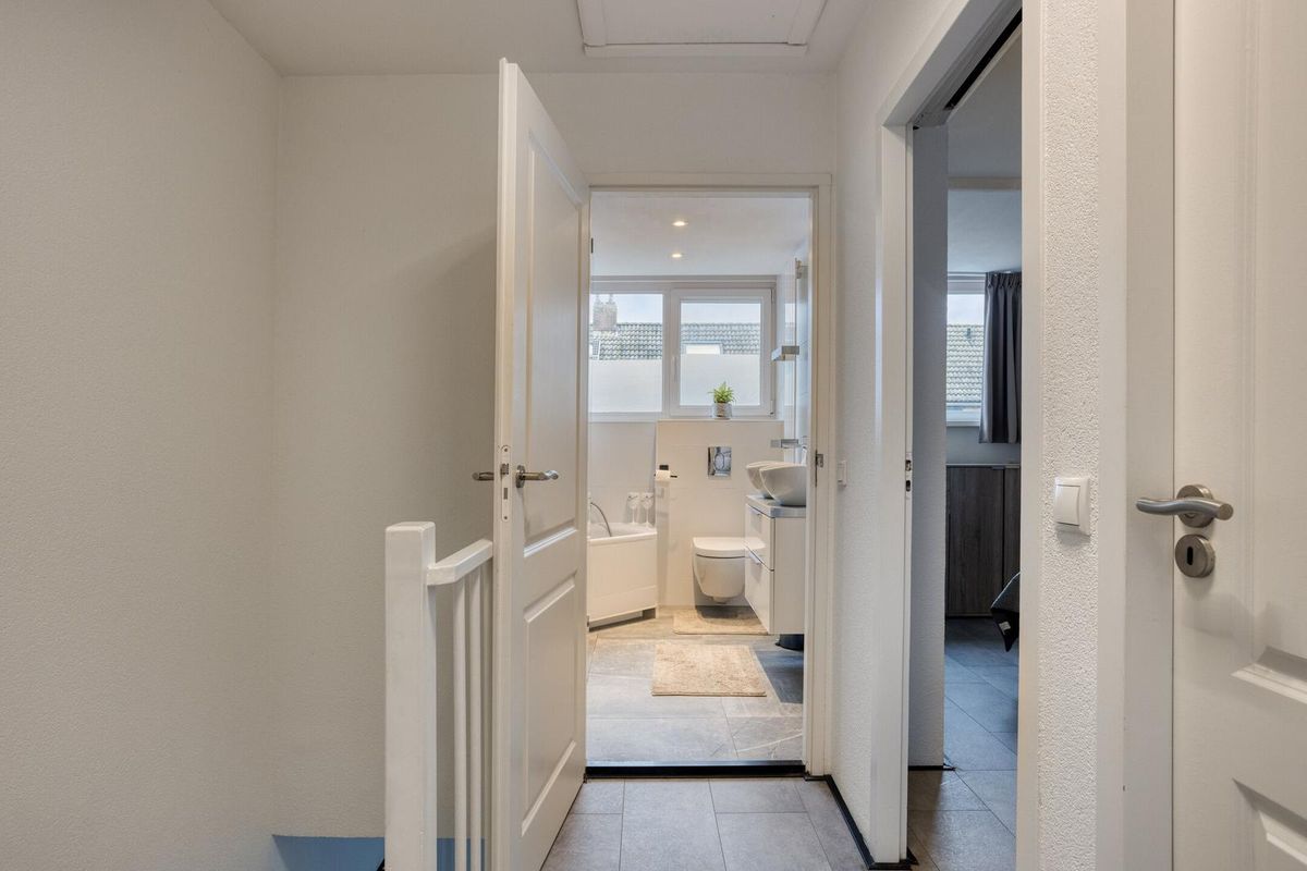 Terug naar de hal en naar de eerste verdieping. Via de gemoderniseerde trap met verlichting kom je op de overloop. Hier heb je toegang tot de 3 kamers, ruime badkamer en bergvliering. Aan de voorzijde de ruime slaapkamer gelegen in de dakkapel. Aan de achterzijde twee slaapkamers, waarvan er een is ingedeeld als walk in closet. De moderne badkamer is voorzien van een ruime inloopdouche, jacuzzi, modern toilet en wastafeltafelmeubel met dubbele waskommen. Door het realiseren van de dakkapel is deze ruimte net zoals de hal erg prettig geworden qua stahoogte. In de hal heb je toegang tot de vliering en opstelling cv-ketel (Nefit 2017) en wasruimte is gerealiseerd in de walk in closet.