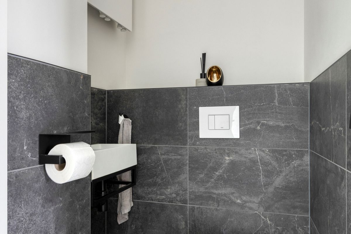 De nette badkamer is recentelijk vernieuwd en compleet uitgevoerd met een douche, dubbele wastafelmeubel en toilet.