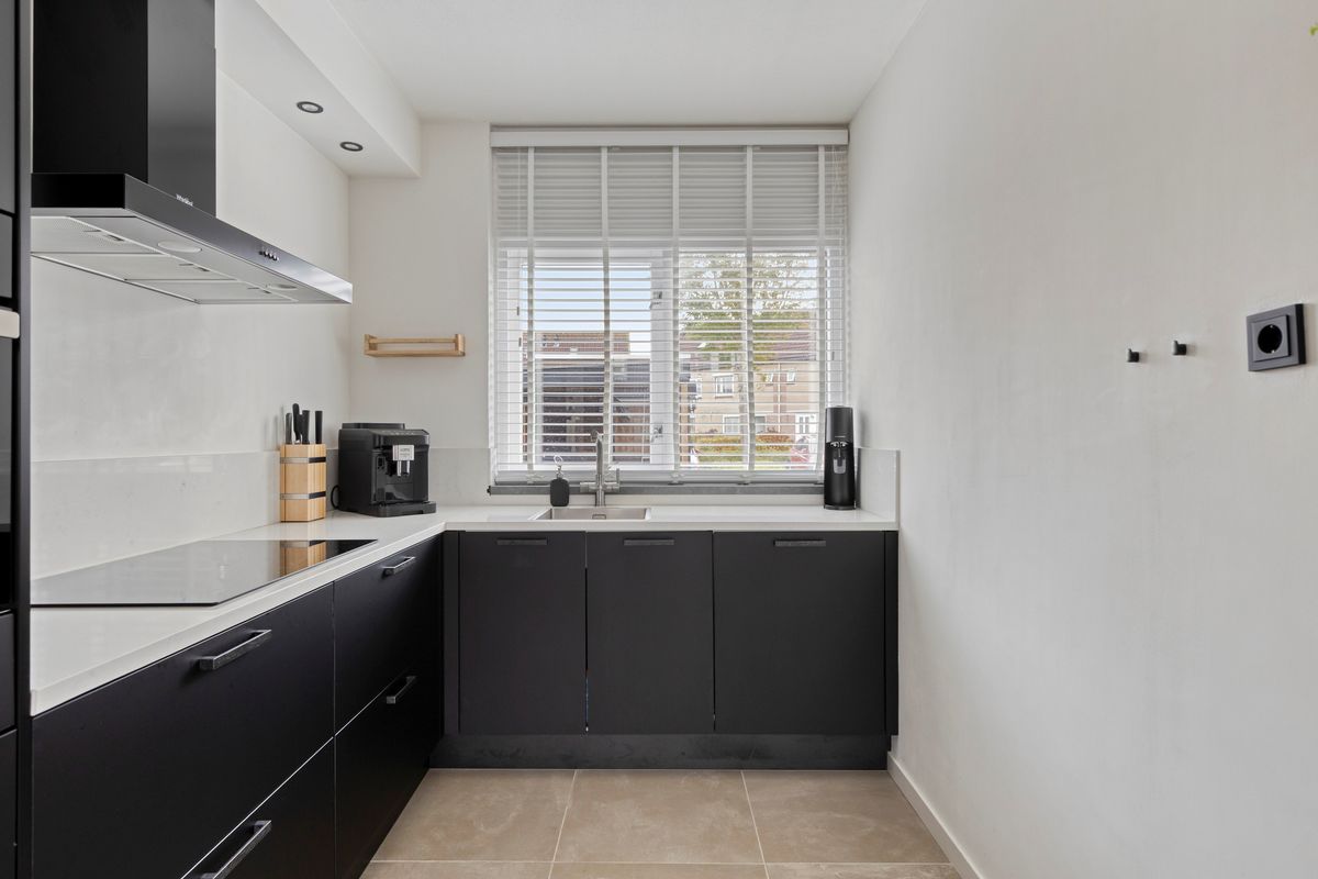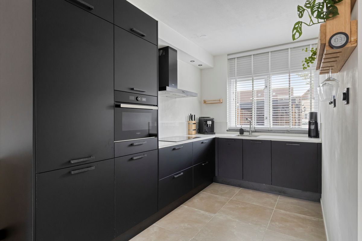 De luxe keuken in hoekopstelling is aan de voorzijde gesitueerd. De keuken is voorzien van diverse inbouwapparatuur.