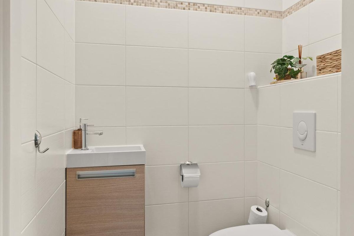 -Toilet: Compleet betegeld toilet met lichte wandtegels en een houtlook vloer. Voorzien van een wastafelmeubel.
