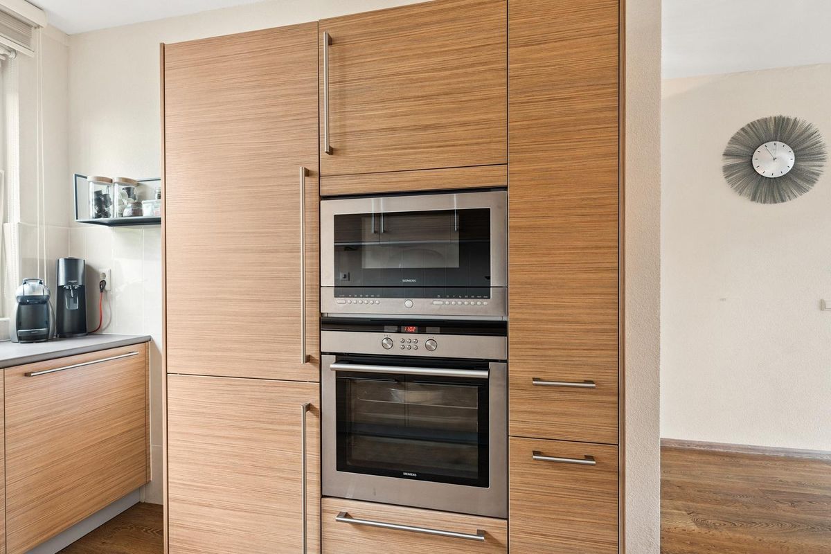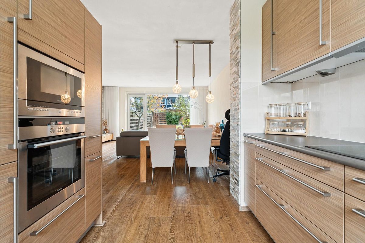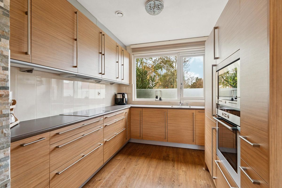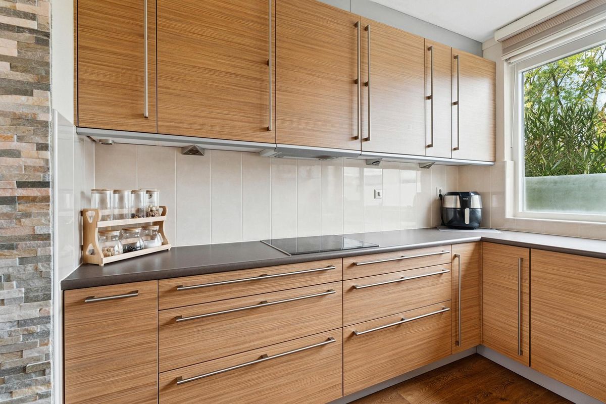 -Keuken: Moderne keuken met houtlook kasten en een strak donker werkblad. De keuken is voorzien van inbouwapparatuur en biedt veel opbergruimte en werkcomfort.
