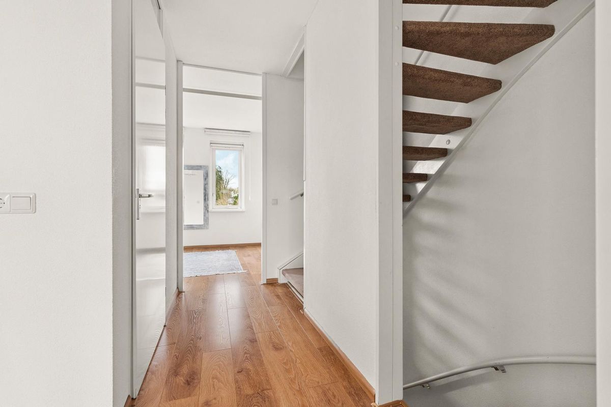 -Overloop: Lichte overloop met laminaatvloer en witte wanden. Vanuit hier zijn de slaapkamers en de badkamer bereikbaar.