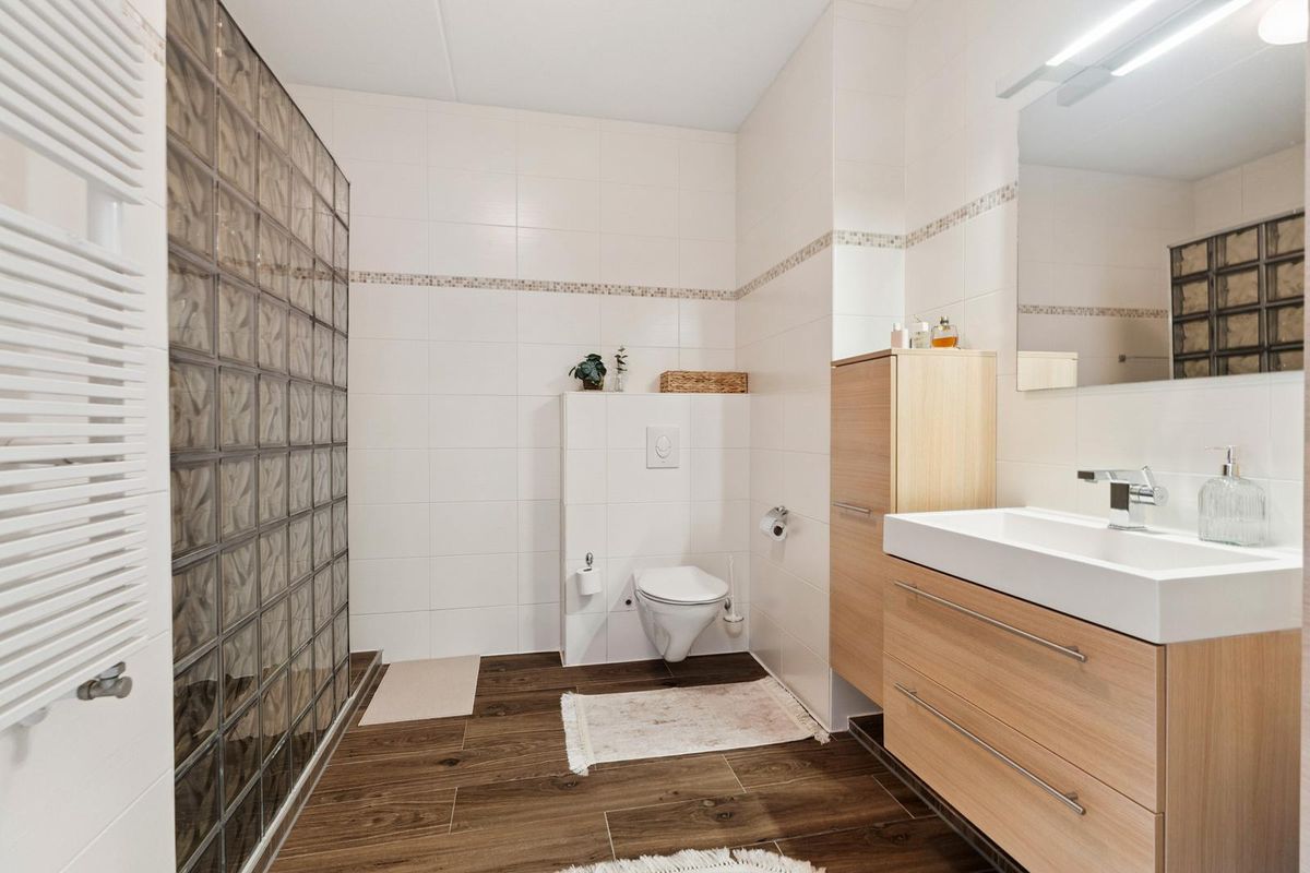 -Badkamer: Stijlvolle en ruime badkamer met een warme houtlook vloer en compleet betegelde wanden. Voorzien van een glazen douchewand, toilet en een strak wastafelmeubel met veel opbergruimte. De ruimte heeft een nette en moderne uitstraling.