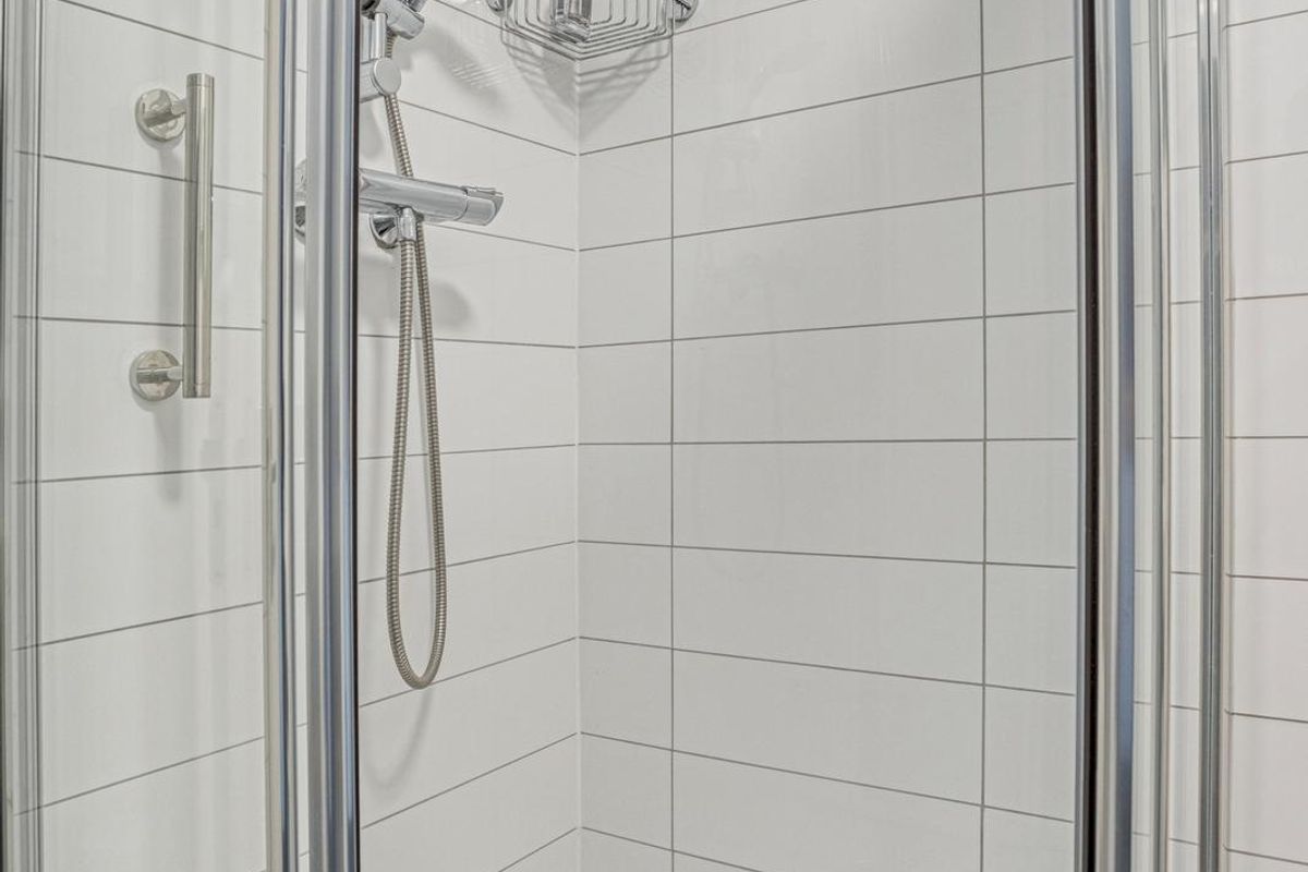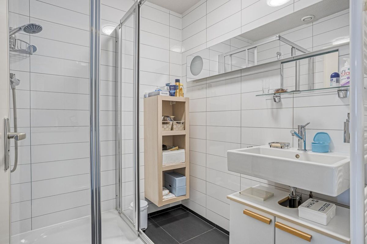 * Moderne volledig betegelde badkamer van ca. 1.89 x 1.66 voorzien van douchecabine en wastafel met meubel.