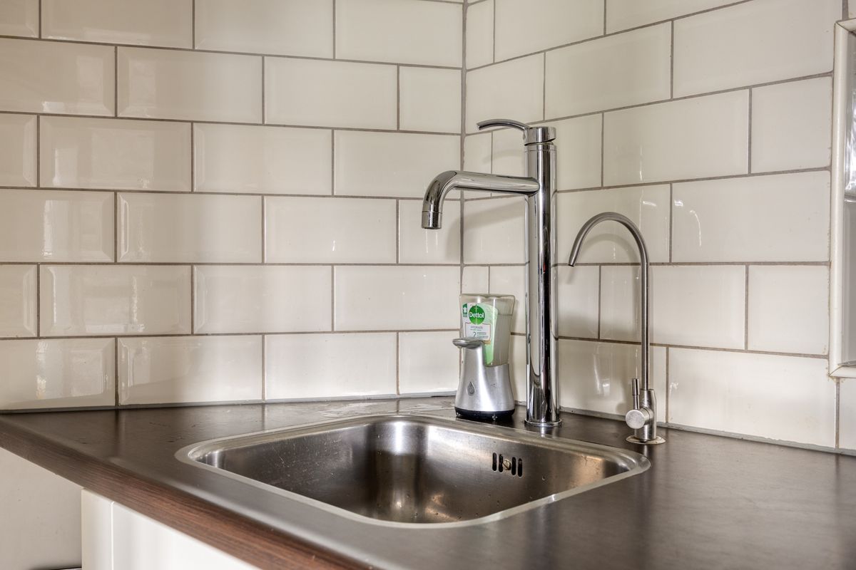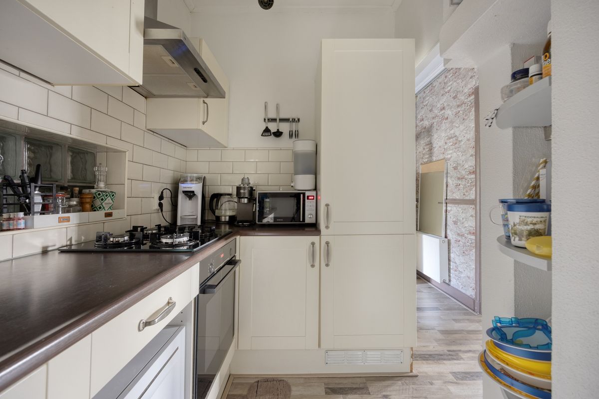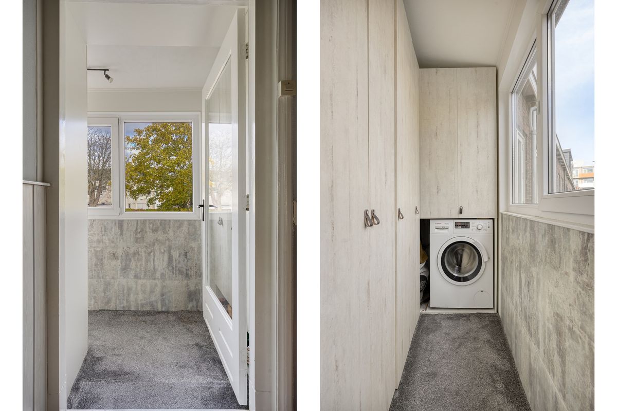 Het voormalige balkon aan de achterzijde is dicht gebouwd en is nu in gebruik als bijkeuken. Hier is ook de aansluiting van de wasmachine.