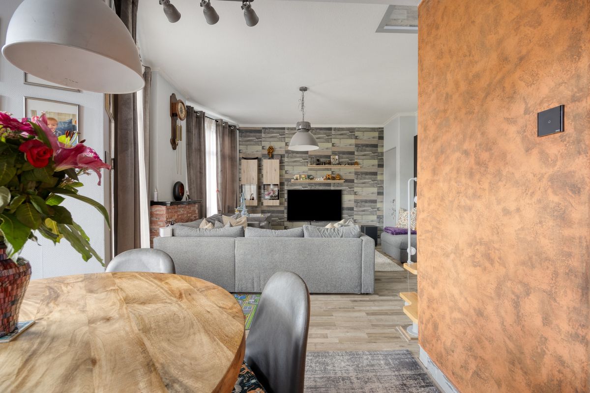 Ruime en speels ingedeelde woonkamer met toegang tot het balkon aan de voorzijde. De woonkamer heeft een laminaatvloer afwerking en een trap naar de tweede verdieping.