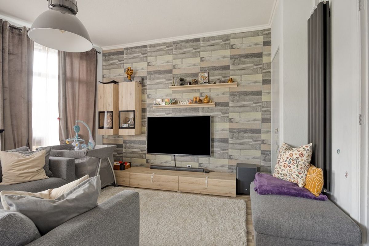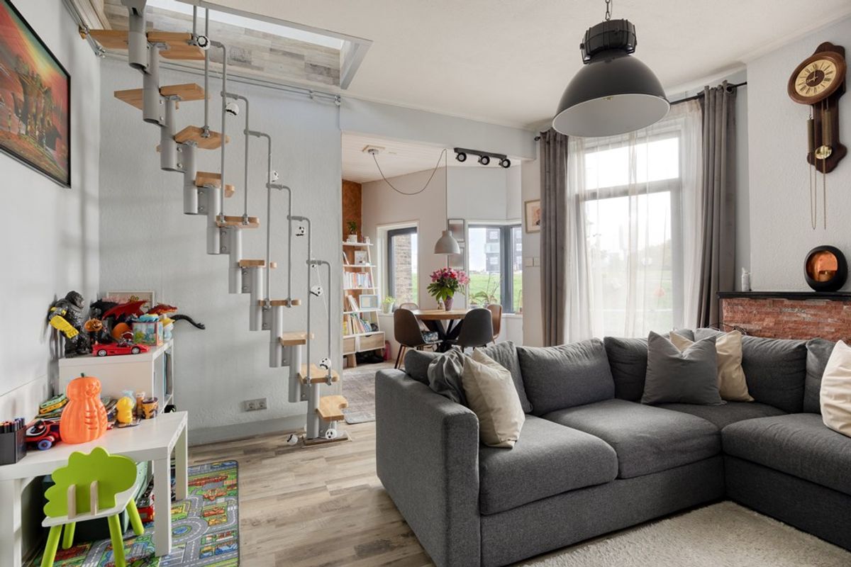 Ruime en speels ingedeelde woonkamer met toegang tot het balkon aan de voorzijde. De woonkamer heeft een laminaatvloer afwerking en een trap naar de tweede verdieping.