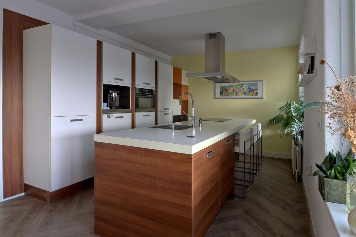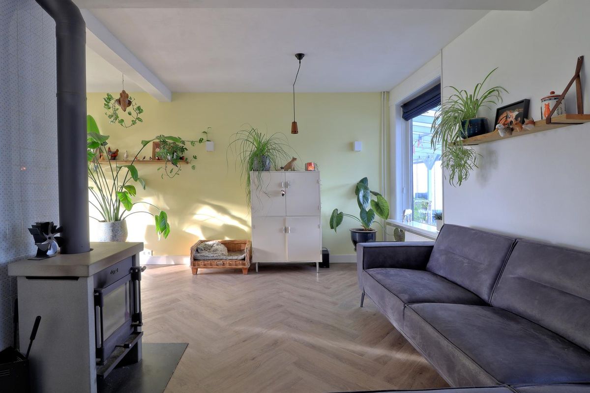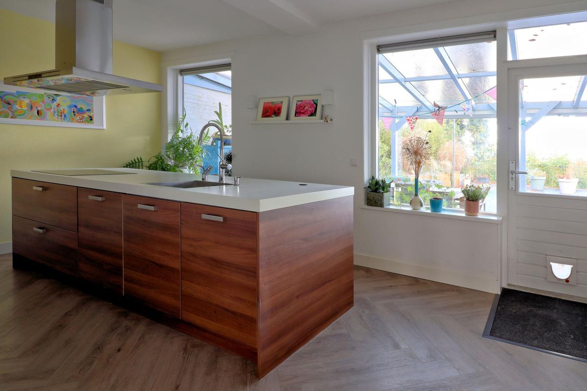 Grote L-vormige woonkamer met zithoek en eethoek, knusse houtkachel (2017, met vernieuwde dubbelwandige afvoerbuis) en met luxe – in de muur weggewerkte - wandverlichting op de gesierpleisterde muren. Vanuit de woonkamer bereikt u via een tussenhal de grote woonkeuken met moderne keuken met kook- en spoeleiland, voorzien van inbouwapparatuur ( 4 pits inductie, afzuigkap, koelkast, vriezer, vaatwasser en koffiemachine. De keuken is in ca. 2015 gerealiseerd en heeft een spiksplinter nieuwe vaatwasser.