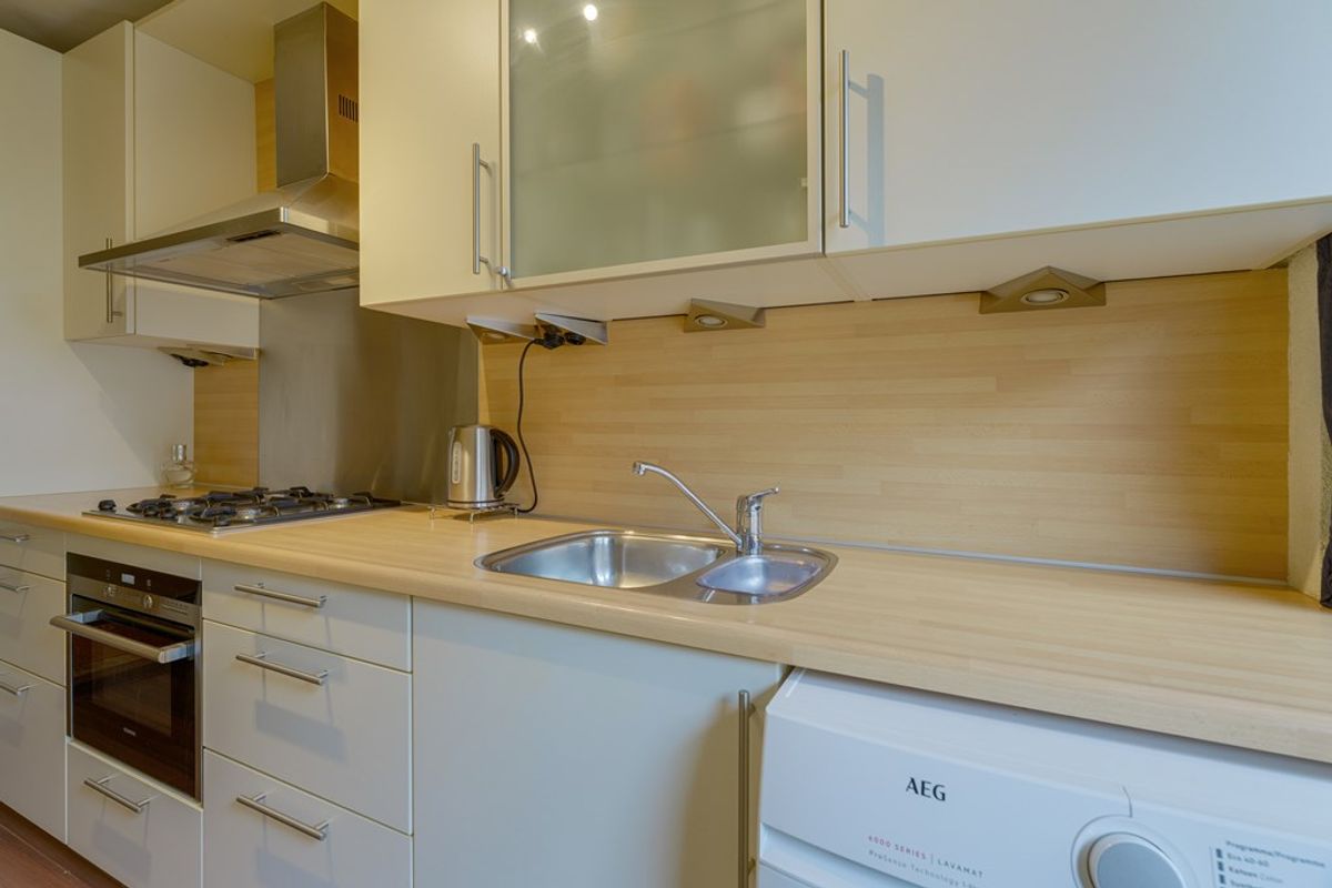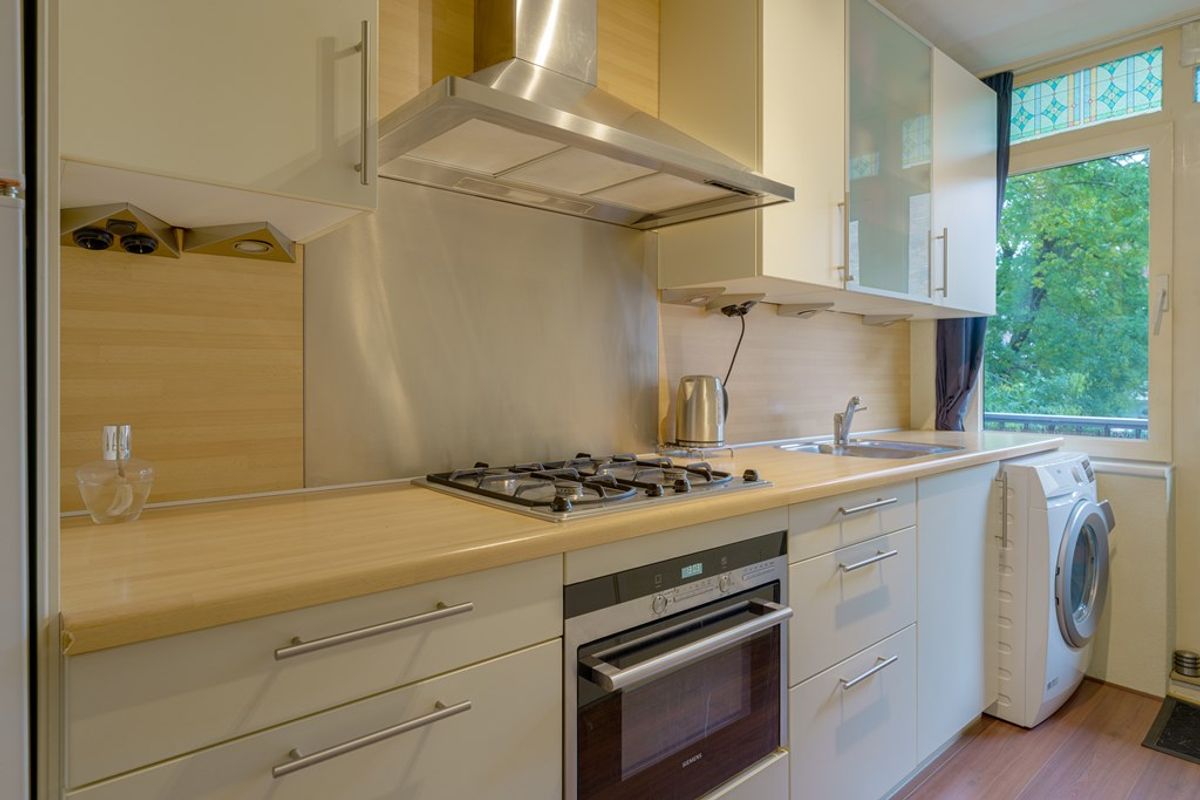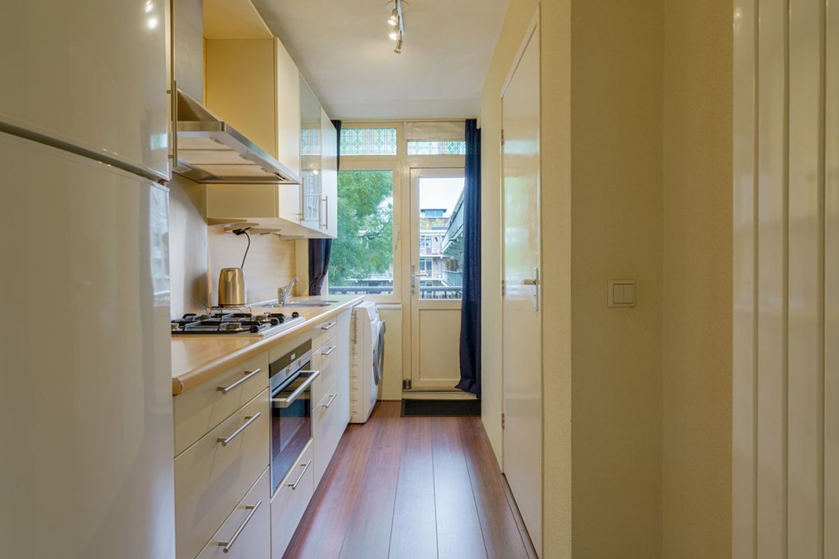 Via de deur in de keuken bereikt u het gezellige balkon, voorzien van een praktisch afdak en houten zijwanden die zorgen voor beschutting en privacy. Vanaf hier geniet u van een prachtig, vrij uitzicht over groen en moderne stadsarchitectuur. Het balkon biedt voldoende ruimte voor een gezellig zitje en plantenbakken, waardoor het de ideale plek is voor een ochtendkoffie.