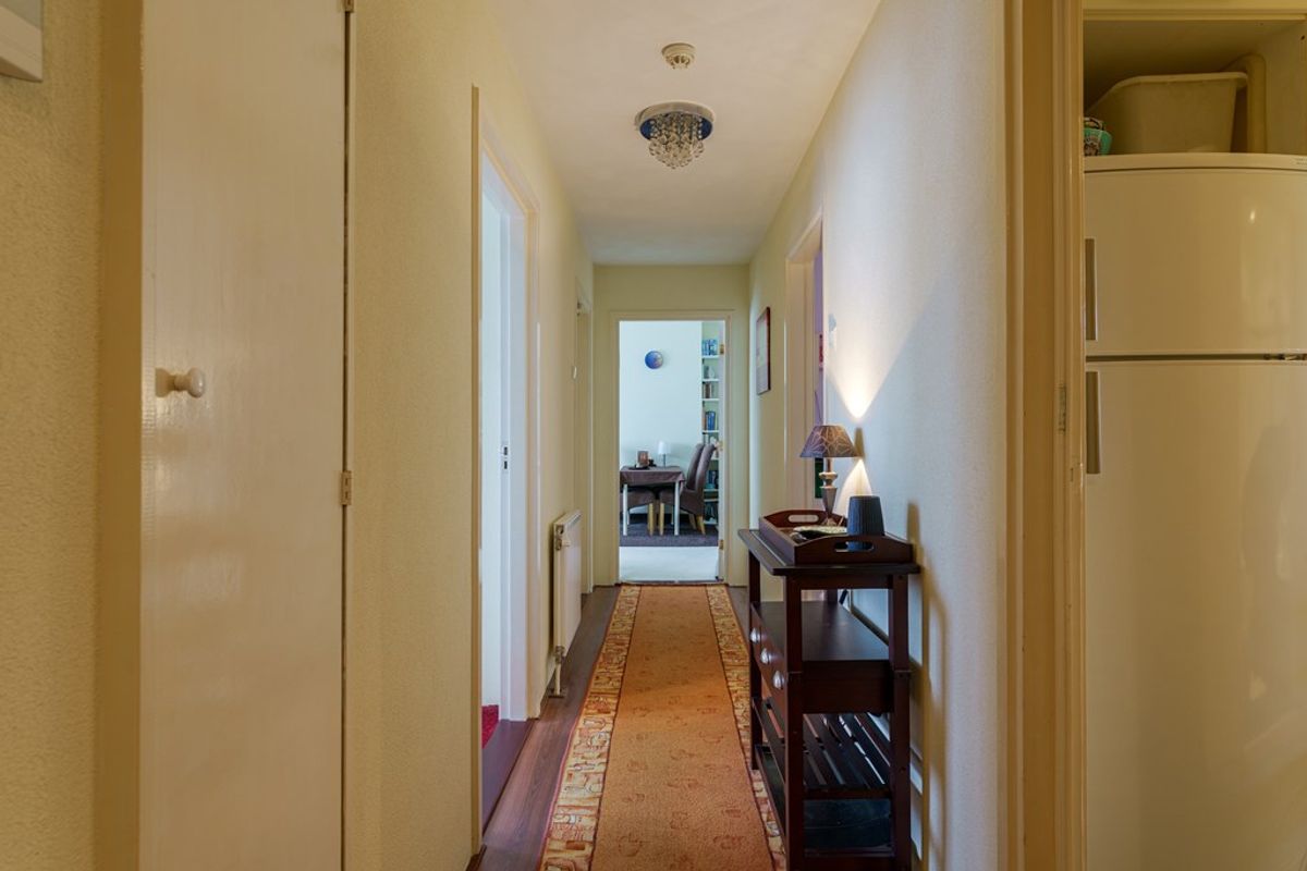 The bathroom, accessible from the kitchen, includes a sit-down bathtub, offering a pleasant space to relax. Two spacious bedrooms are accessible from the hallway. At the end of the hall, you enter the bright and cosy living room, which is connected to an additional bedroom. This home perfectly combines a practical layout with comfortable living spaces.