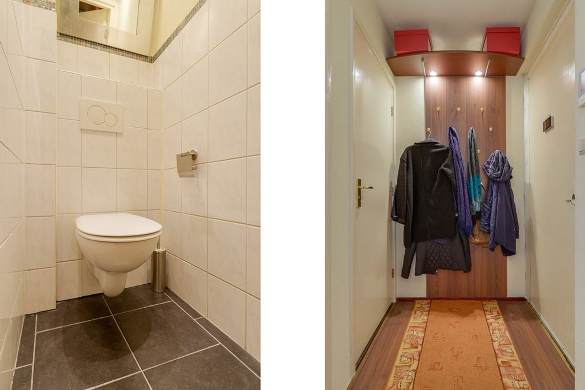 We betreden via de nette, hoge entree de galerij en openen de voordeur van de woning. Bij binnenkomst in de hal valt direct de praktische indeling op. Aan de hal grenst het moderne toilet, afgewerkt met stijlvol tegelwerk. Naast het toilet bevindt zich de gesloten keuken, compleet met inbouwapparatuur. De keuken is eigentijds vormgegeven met witte kastjes en een licht houten werkblad, wat zorgt voor een frisse en uitnodigende uitstraling.