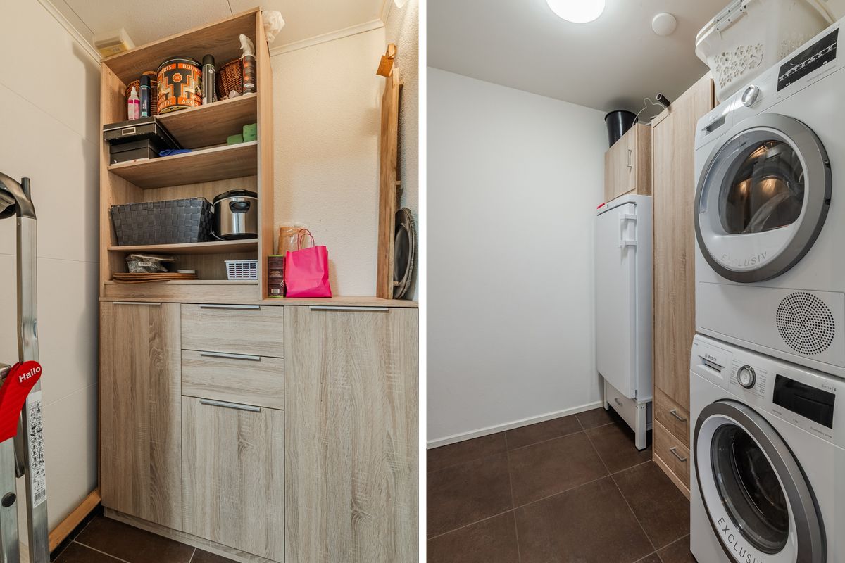 - Bijkeuken met plavuizen vloer, wasmachine-/droger aansluiting en cv-opstelling