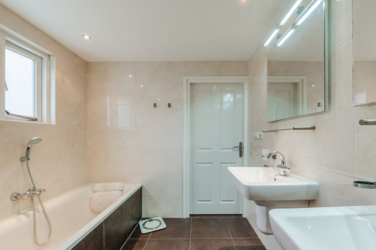 - Badkamer met inloopdouche, dubbele wastafel, ligbad, 3 kasten en plavuizen vloer met vloerverwarming