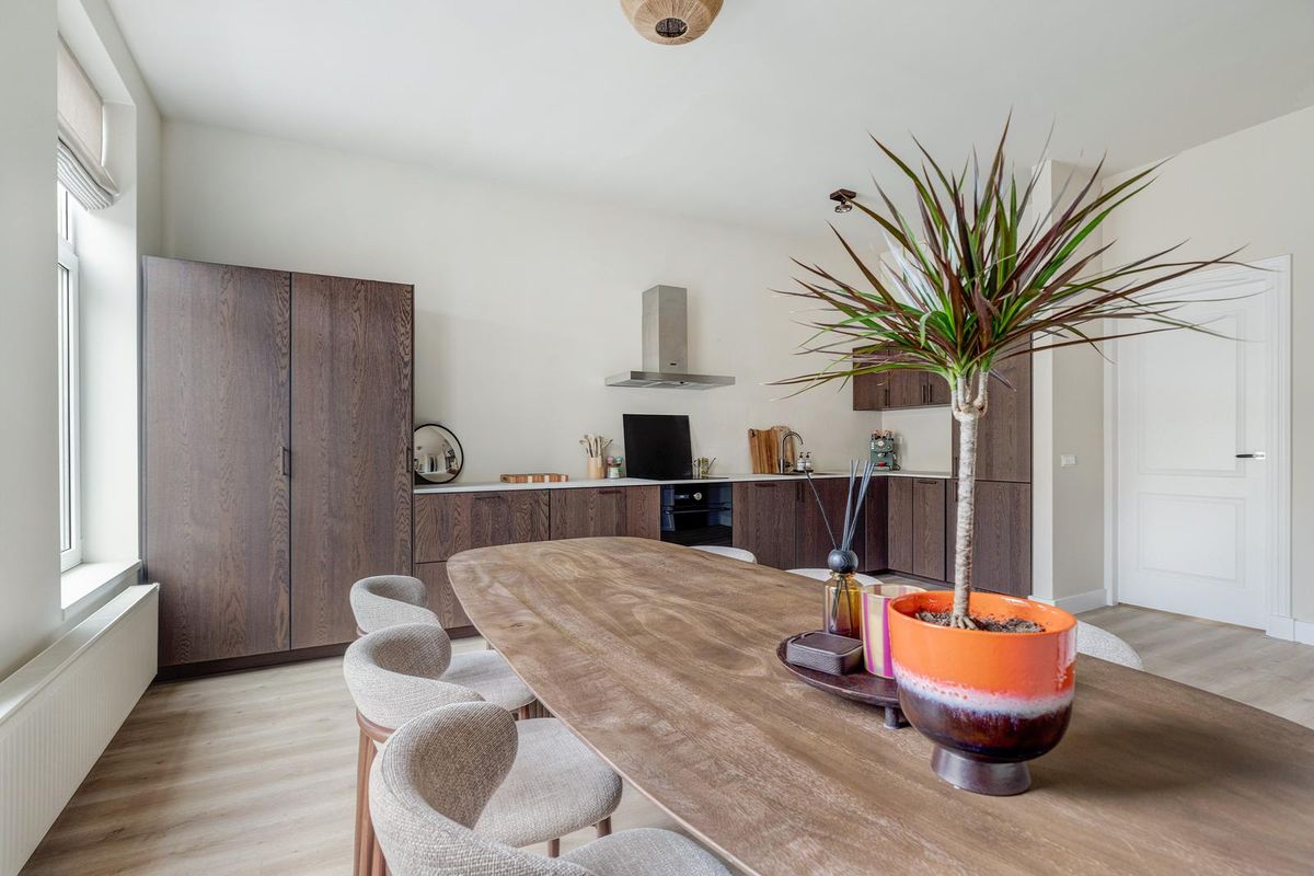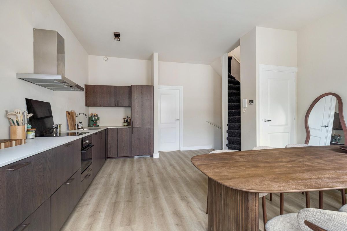 Via de trapopgang bereik je de eerste verdieping, waar direct de royale eetkamer met open keuken aan de voorzijde van de woning opvalt. De keuken is modern (2025) en ruim opgezet, perfect voor wie graag kookt en tegelijkertijd contact wil houden met gasten aan tafel. De eetkamer biedt volop ruimte voor een grote eettafel, dé plek voor gezellige etentjes en lange avonden met familie en vrienden.