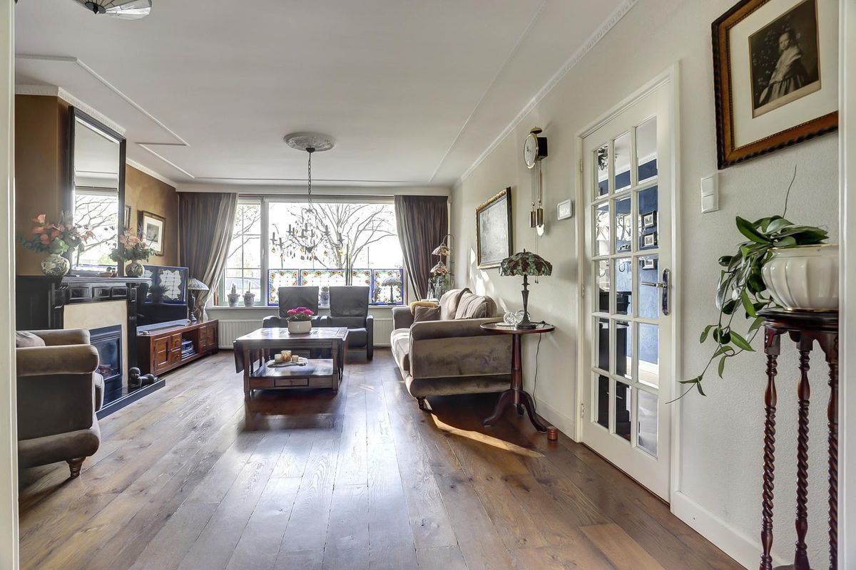 Aan de rechterzijde tref je de deur naar de woonkamer. Ook hier ligt er een sfeervolle en warme houten vloer. De woonkamer heeft fantastisch licht door de grote raampartijen een weerszijden (doorzon). Voorheen was er een gashaard, maar is veranderd naar een elektrische haard. Deze is heel gemakkelijk weer te herstellen!