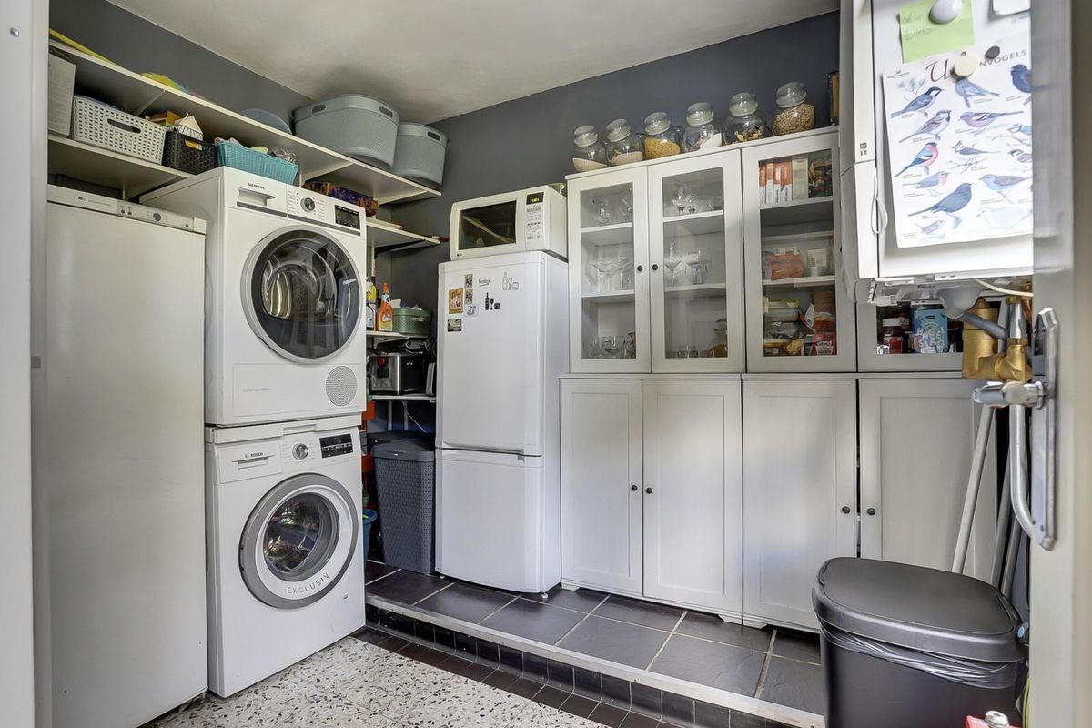 De woonkeuken bevindt zich aan de achterzijde van de woning, heeft een L-vorm en is voorzien van diverse inbouwapparatuur. Via de keuken heb je toegang naar de riante bijkeuken, waar zich de opstelplaats van de wasmachine, droger en CV-ketel bevinden. Vanuit de keuken loop je naar beneden de tuin in en naar het onderhuis. Dit onderhuis is de droom van iedere man: een perfecte ruimte voor als je van hobbyen of klussen houdt, maar gewoon gebruiken als opslagruimte kan natuurlijk ook.