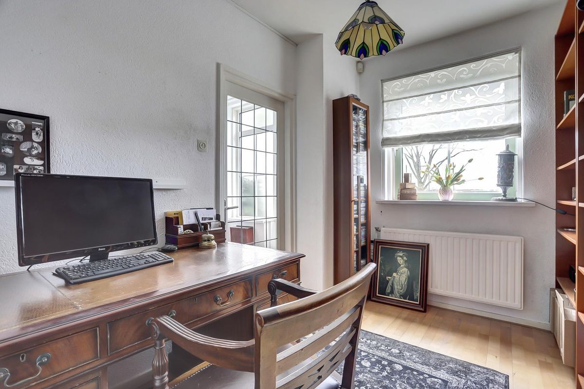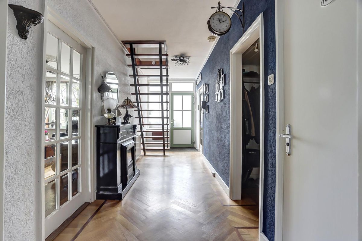 Bij binnenkomst in de hal kom je direct binnen met een warm gevoel door de houten parketvloer. De entreehal is ruim en verbindt verschillende ruimtes met elkaar. Hier tref je ook de open trap naar de eerste verdieping. Aan je linkerhand tref je als eerste een slaapkamer, welke momenteel dient als werkkamer. Vervolgens tref je een ruime bergkast voor extra jassen, schoenen of schoonmaakspullen. Het toilet is geen standaard toilet, deze is een stuk comfortabeler door de grootte ervan en is tevens ook voorzien van een fontein.