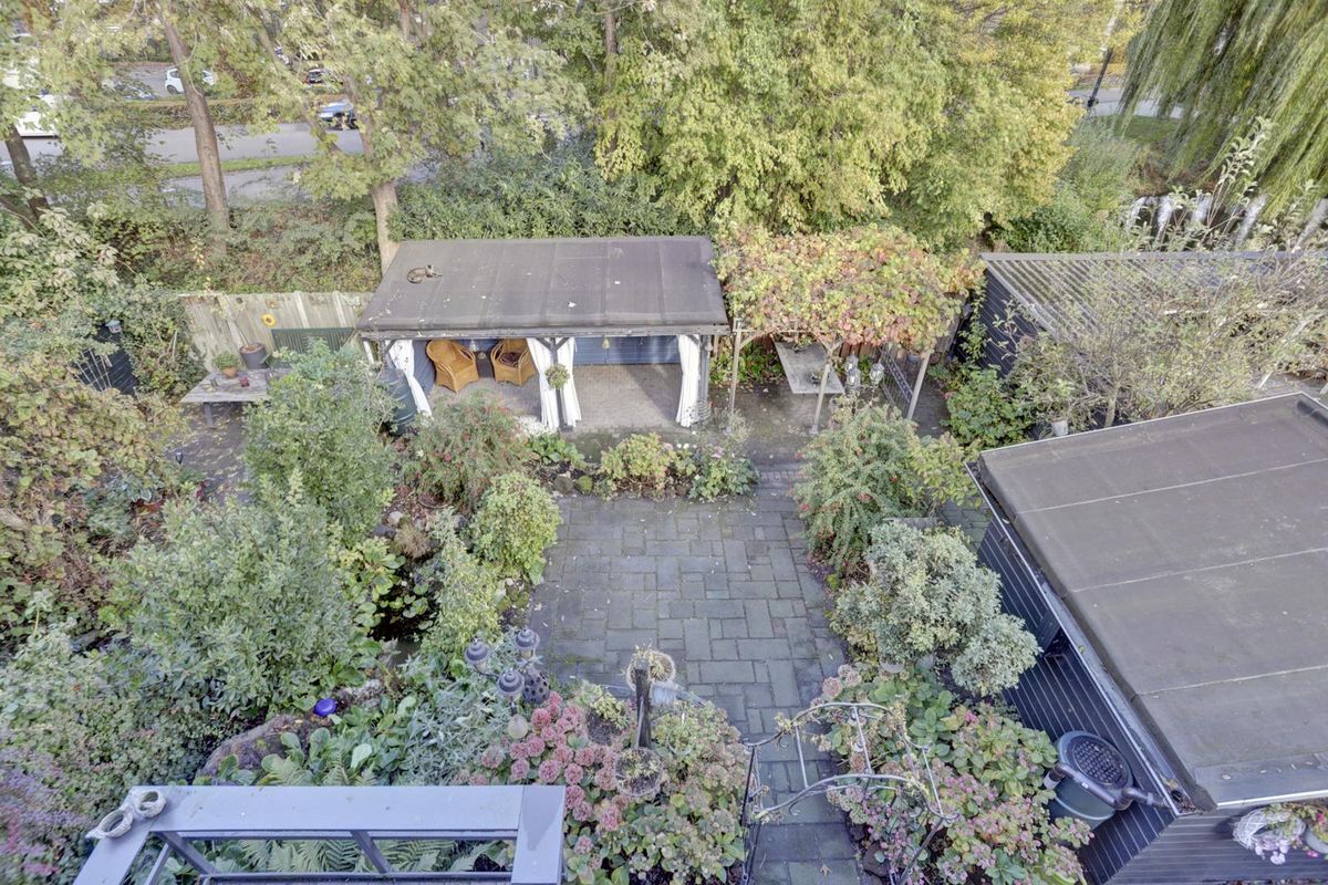 Heerlijk groene tuin, welke veel privacy biedt voor ultieme ontspanning! Deze is te bereiken via de zijkant van de woning, via een achterom en ook via de deur van de keuken. Hier kun je lang genieten onder de overkapping. Alle tuinkussens kun je perfect kwijt in het tuinhuis. Of toch die motor?