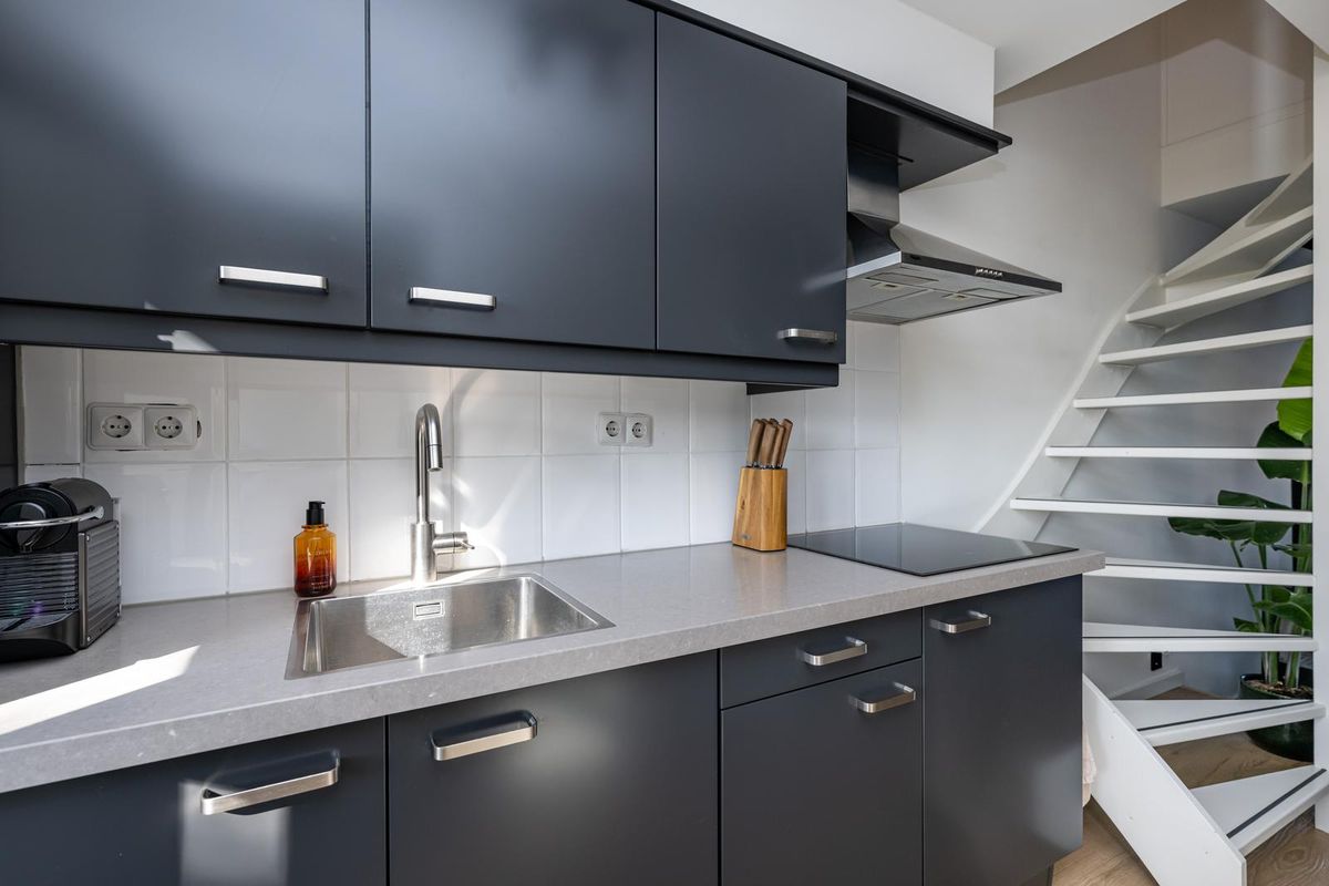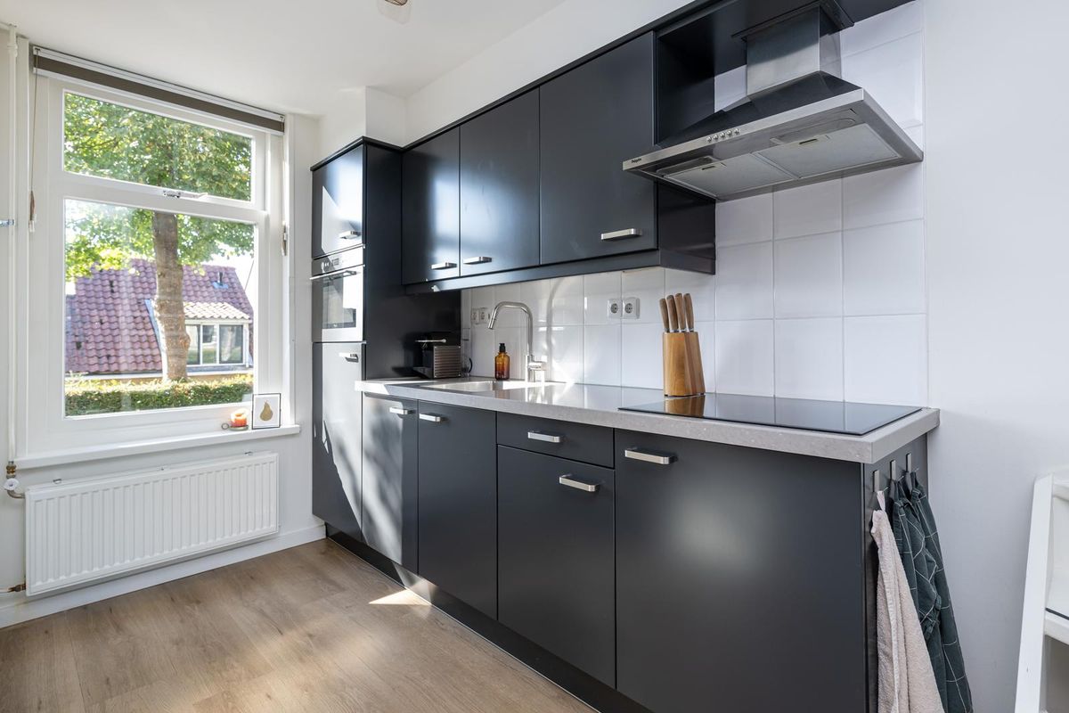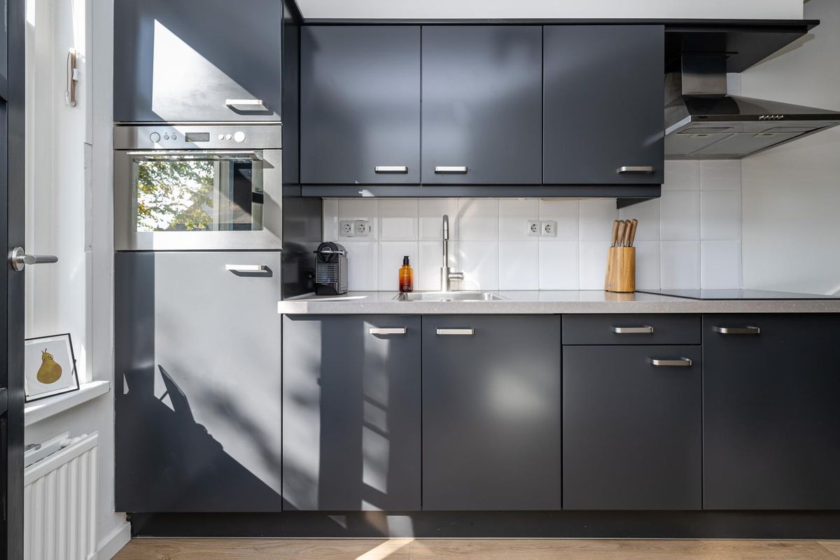 De moderne keuken is uitgevoerd in een donkere, eigentijdse stijl en voorzien van diverse inbouwapparatuur zoals een oven, inductiekookplaat, afzuigkap en koelkast. Vanuit de keuken loop je door naar de gezellige woonkamer.
