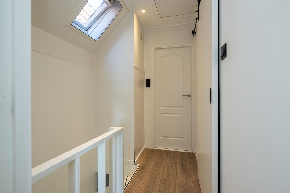 Op de eerste verdieping vind je twee slaapkamers en de moderne badkamer met inloopdouche, wastafelmeubel, toilet en aansluiting voor de wasmachine. De overloop is extra licht dankzij het dakraam en biedt toegang tot een bergzolder – handig voor extra opbergruimte.