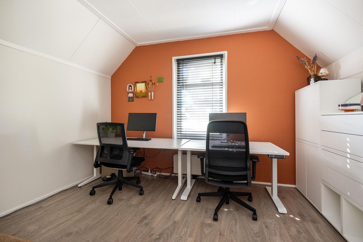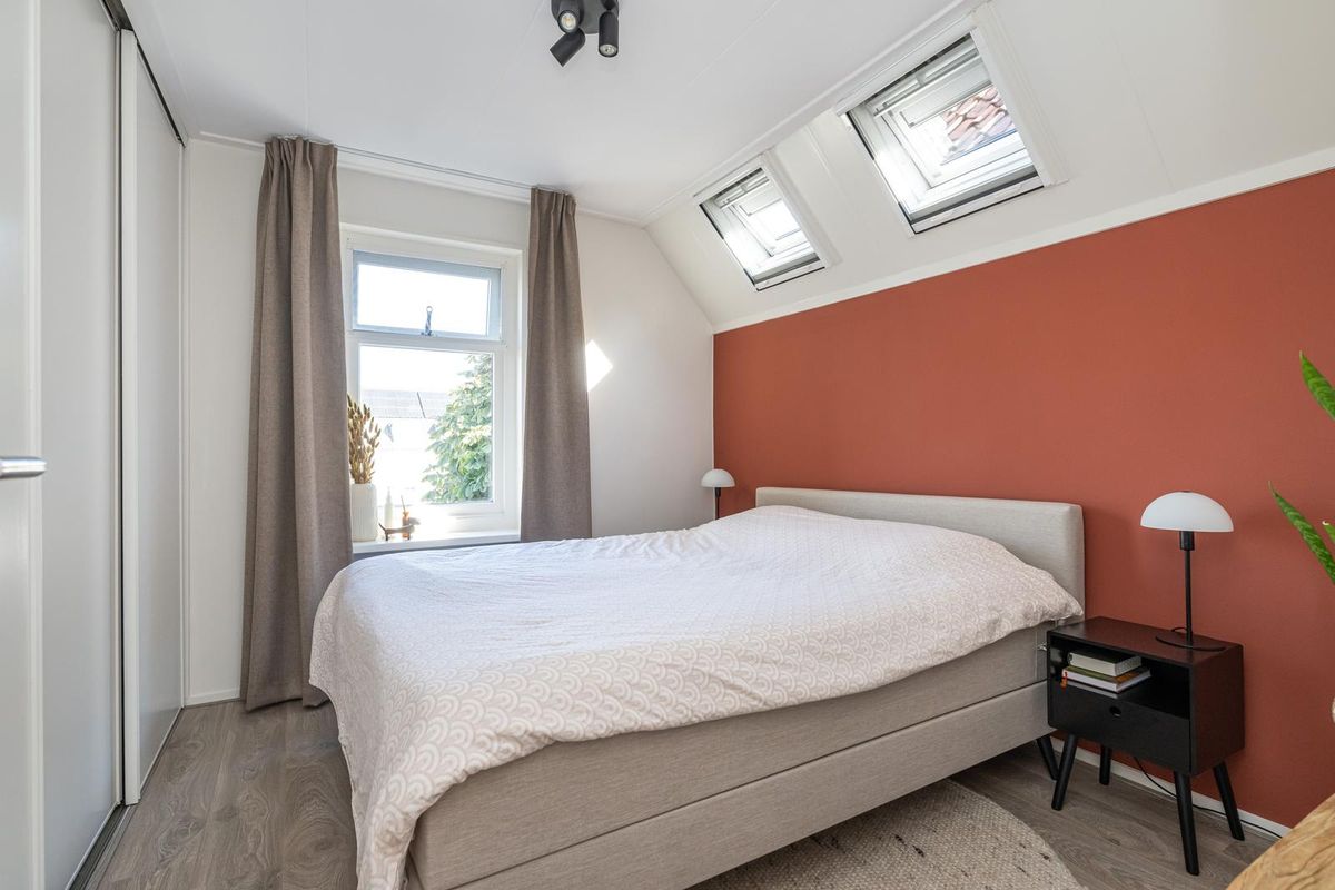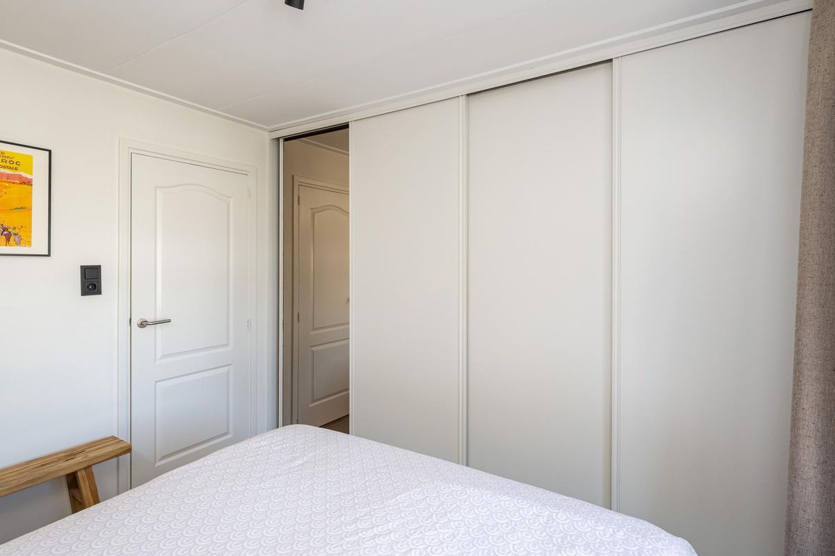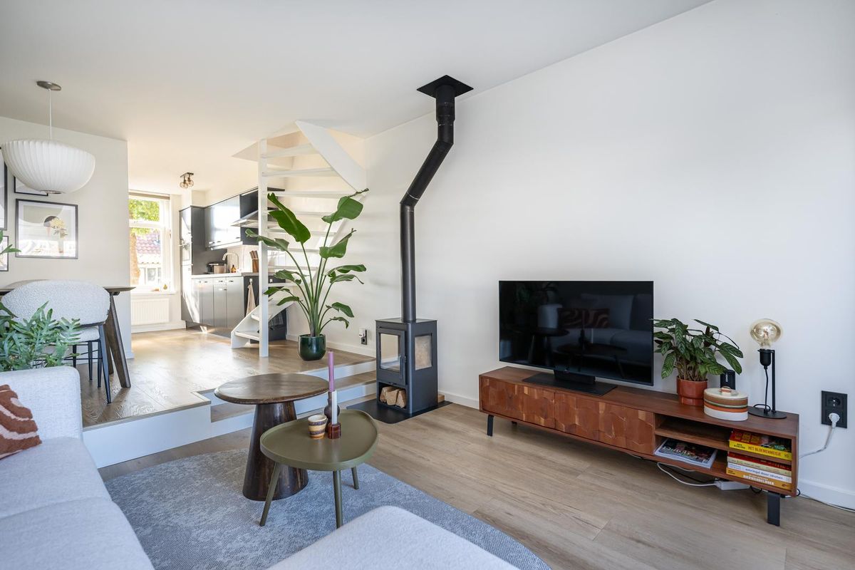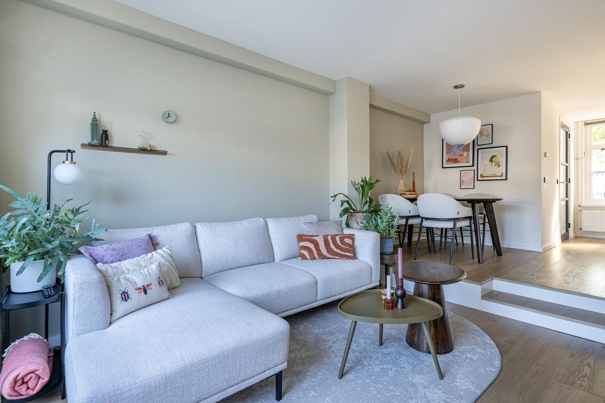 De woonkamer ligt iets lager dan de keuken, wat zorgt voor een speelse indeling en knusse sfeer. Dankzij de grote schuifpui stroomt het licht naar binnen en loopt binnen naadloos over in buiten. De onderhoudsvriendelijke tuin ligt op het noorden, maar door de open ligging geniet je hier toch volop van licht. Achterin de tuin staat een stenen berging – ideaal voor fietsen of tuinkussens.
