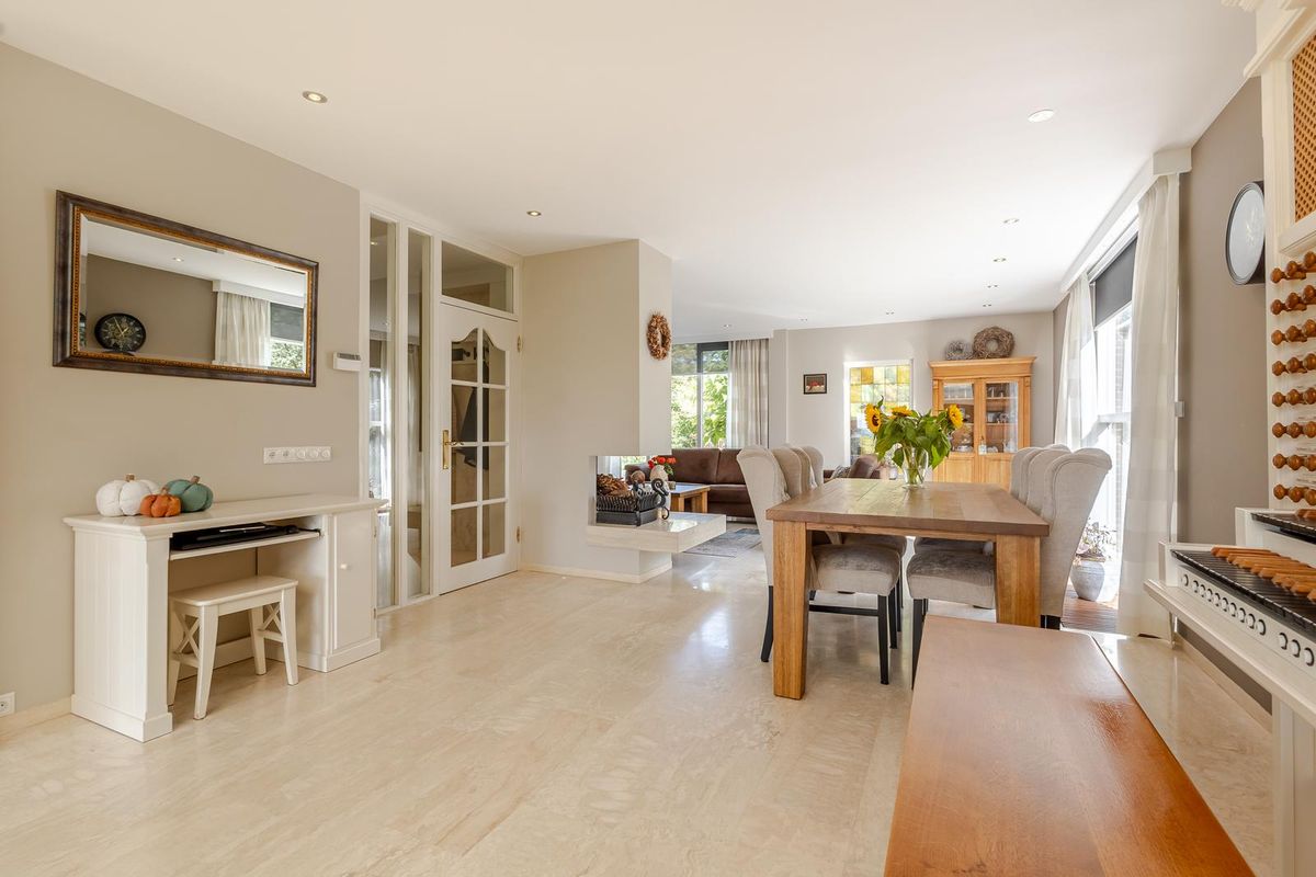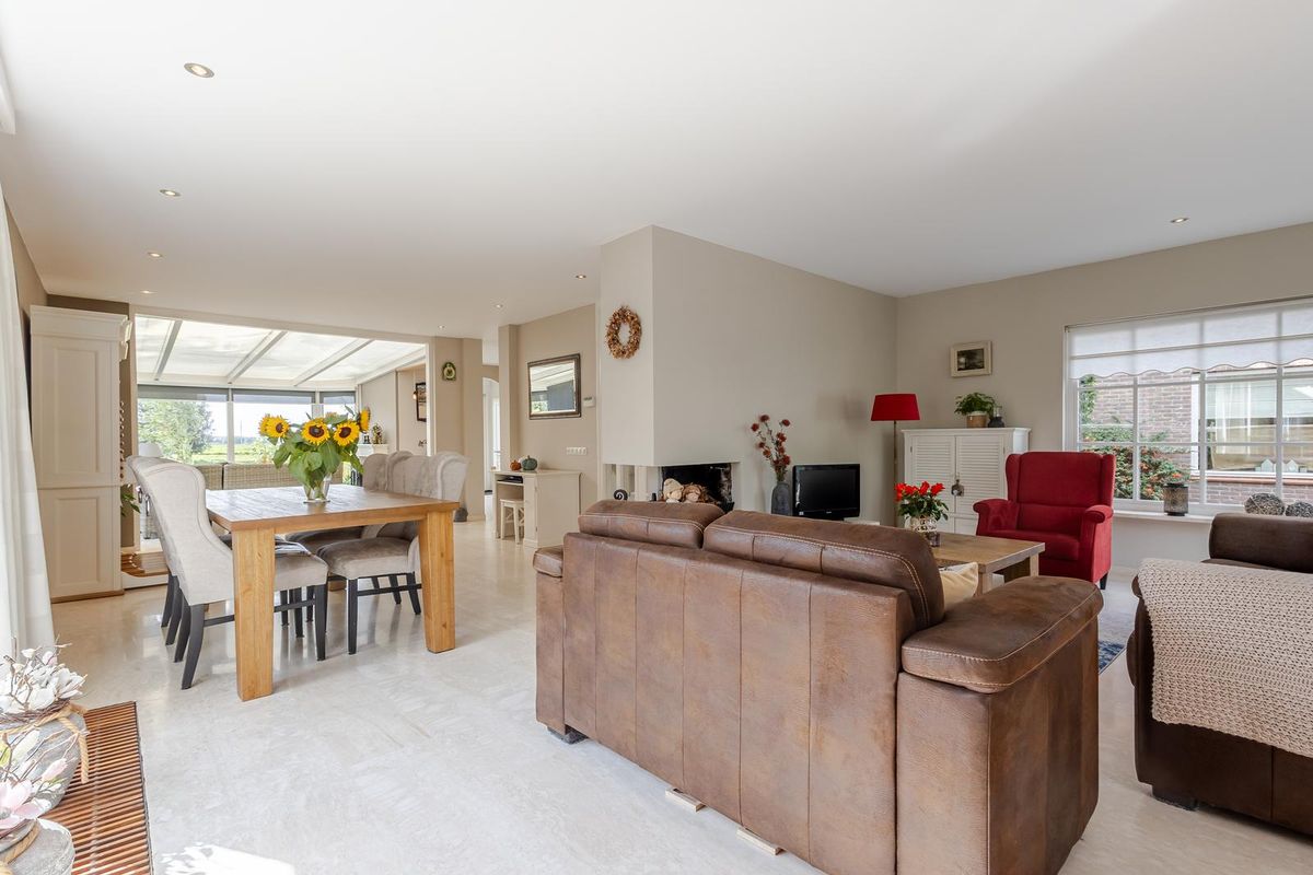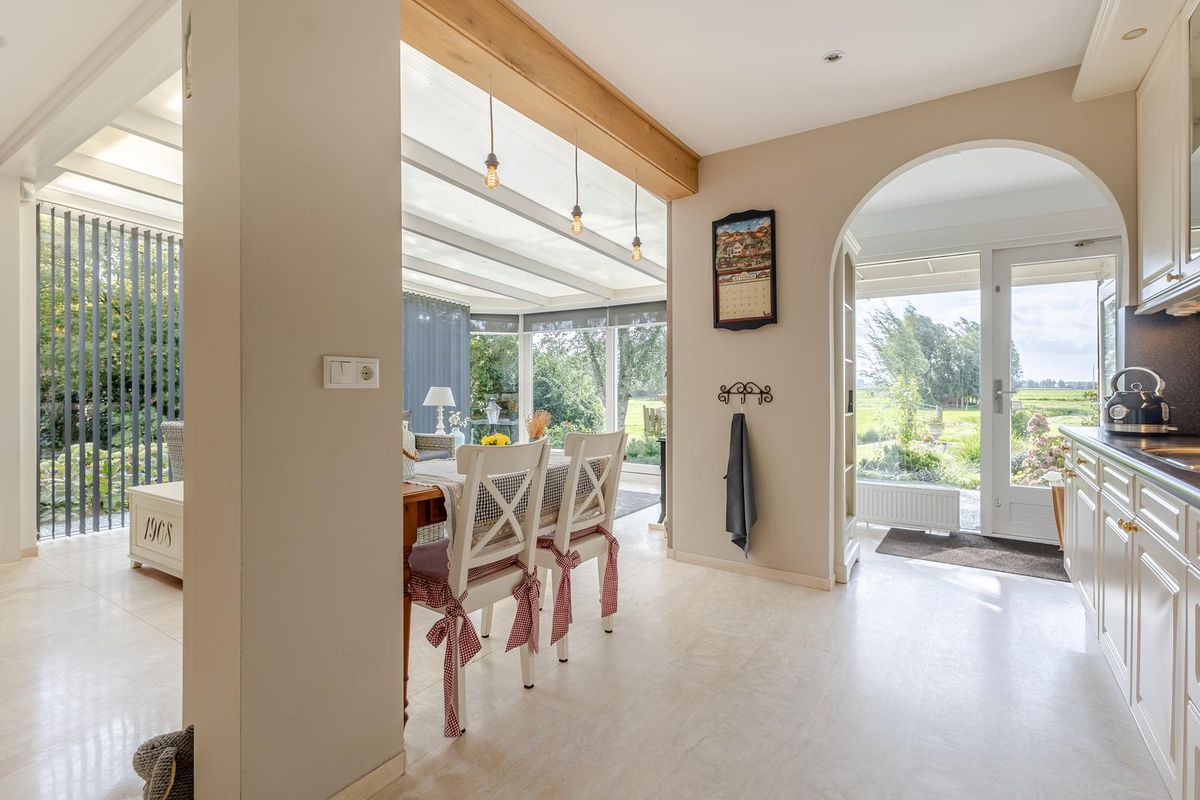 Binnen beschikt u over 160 m² woonoppervlakte. De lichte woonkamer met serre is een heerlijke plek om samen te komen, met volop raampartijen die zorgen voor veel daglicht en prachtig zicht op de polder. ’s Winters wordt de sfeer compleet door de knusse open haard. De keuken is praktisch ingericht en geeft toegang tot de tuin en de royale garage (ca. 7 meter diep).