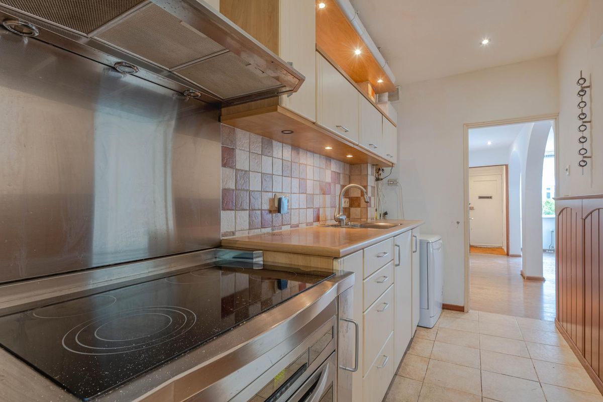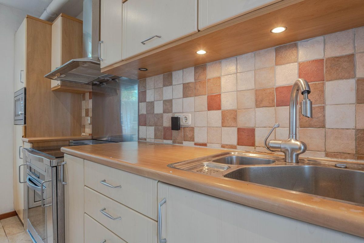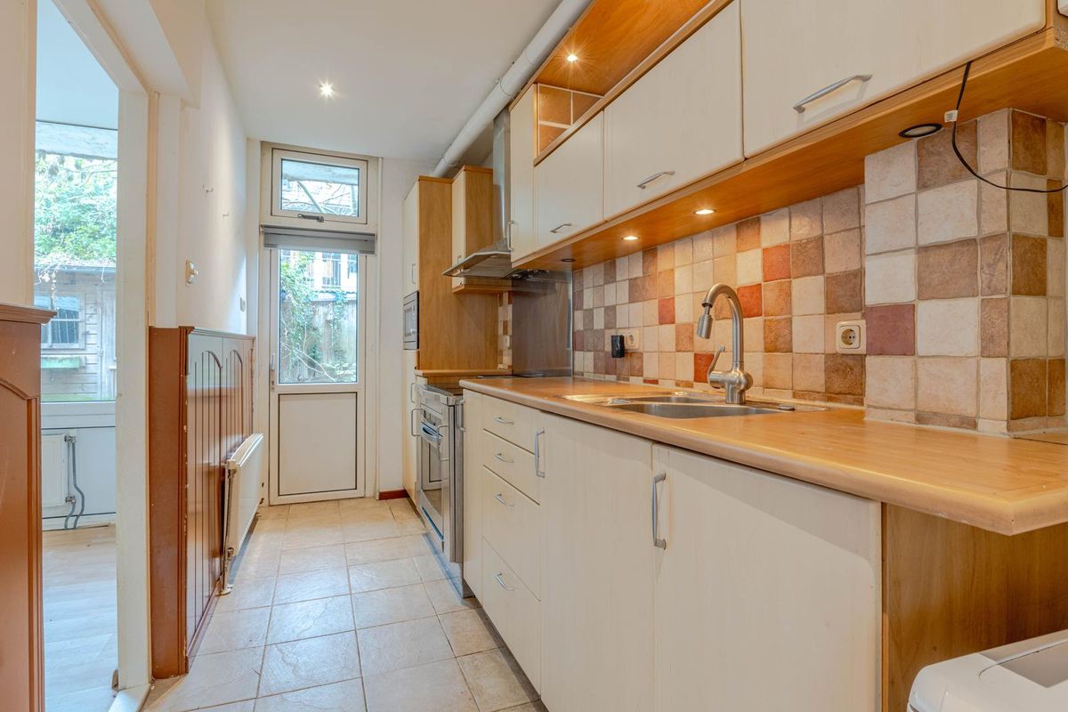 * Keukenruimte voorzien van tegelvloer en keukenopstelling met inbouwapparatuur: fornuis met keramische kookplaat, oven, koelkast, afzuigkap (defect), losse vaatwasmachine en de opstelling van de C.V.-combiketel; toegang tot de achtertuin.