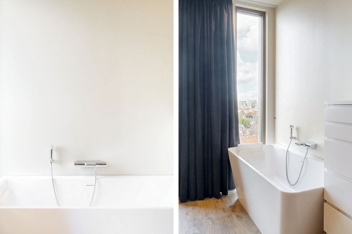 De badkamer biedt een waar wellness-gevoel met een luxe badkuip die is geplaatst in de slaapkamer, zodat je kunt genieten van een prachtig uitzicht terwijl je ontspant. De hoogwaardige badkamer afwerking is verder te zien in de Grohe-mengkranen en de Grohe SmartControl voor douchebediening, waarmee je eenvoudig de perfecte watertemperatuur kunt instellen. Daarnaast is er een bidet-WC voor extra comfort en luxe in de ruimte. Door de waterontharder, is er geen kalk.