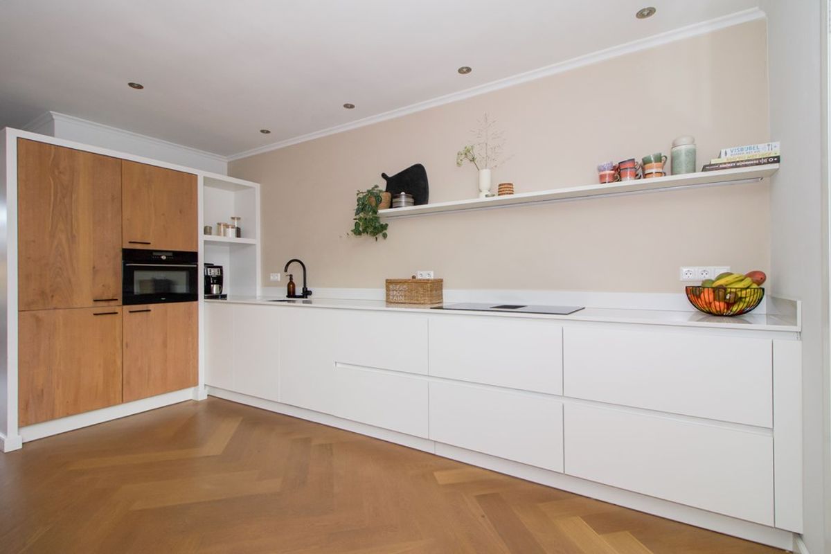 Dit is zo’n woning waar je binnenstapt en direct voelt: hier klopt het. De houten vloer, de lichte inrichting en de haard geven de woonkamer een warme, eigentijdse uitstraling. Alles is de afgelopen jaren met smaak vernieuwd, waardoor het geheel een rustige en stijlvolle basis heeft.