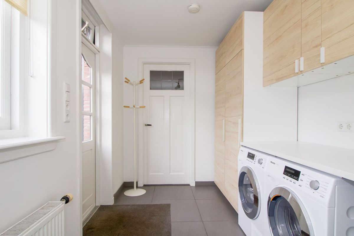 Beneden loopt de ruimte prettig in elkaar over. De woonkamer voelt uitnodigend, terwijl de keuken modern is en flink van formaat, een plek waar koken en samenkomen vanzelf samenkomen. De bijkeuken met wasruimte is een fijne, praktische toevoeging die je dagelijks gemak geeft.