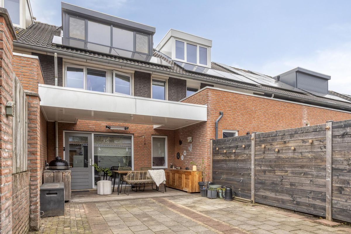 Ook buiten is het genieten. De onderhoudsarme, geheel omsloten achtertuin ligt gunstig op het zuidoosten en biedt volop privacy. Onder de gezellige overkapping kun je heerlijk beschut zitten, perfect voor lange zomeravonden of een ontspannen kop koffie in de ochtendzon. De vrijstaande houten berging met elektra zorgt voor extra bergruimte voor fietsen en tuingereedschap.