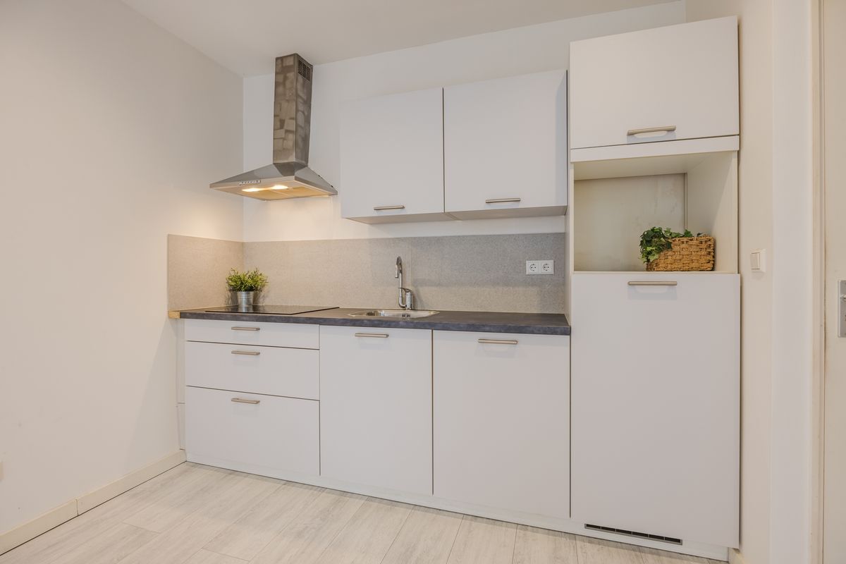 In het halletje heeft u de aansluiting voor de Cv-ketel en de wasmachine. De open keuken is voorzien van een 4-pits elektrische kookplaat, een afzuigkap, vaatwasser, een koelkast en voldoende werk- en kastruimte.