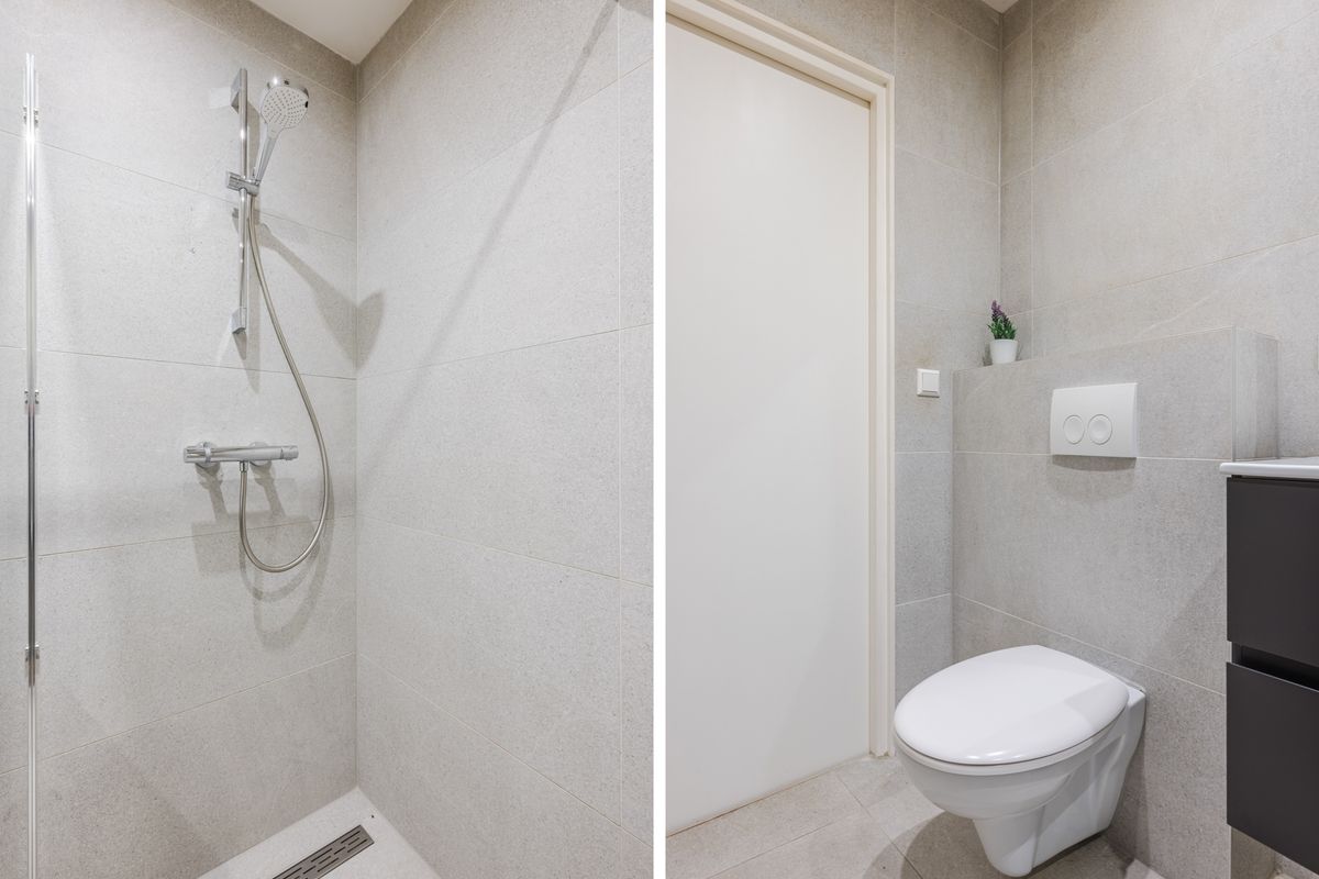 De moderne badkamer is geheel betegeld en voorzien van een inloop douche, wastafel, spiegel, disignradiator en het toilet. Verder beschikt het appartement over een meterkast en een vaste bergkast.
