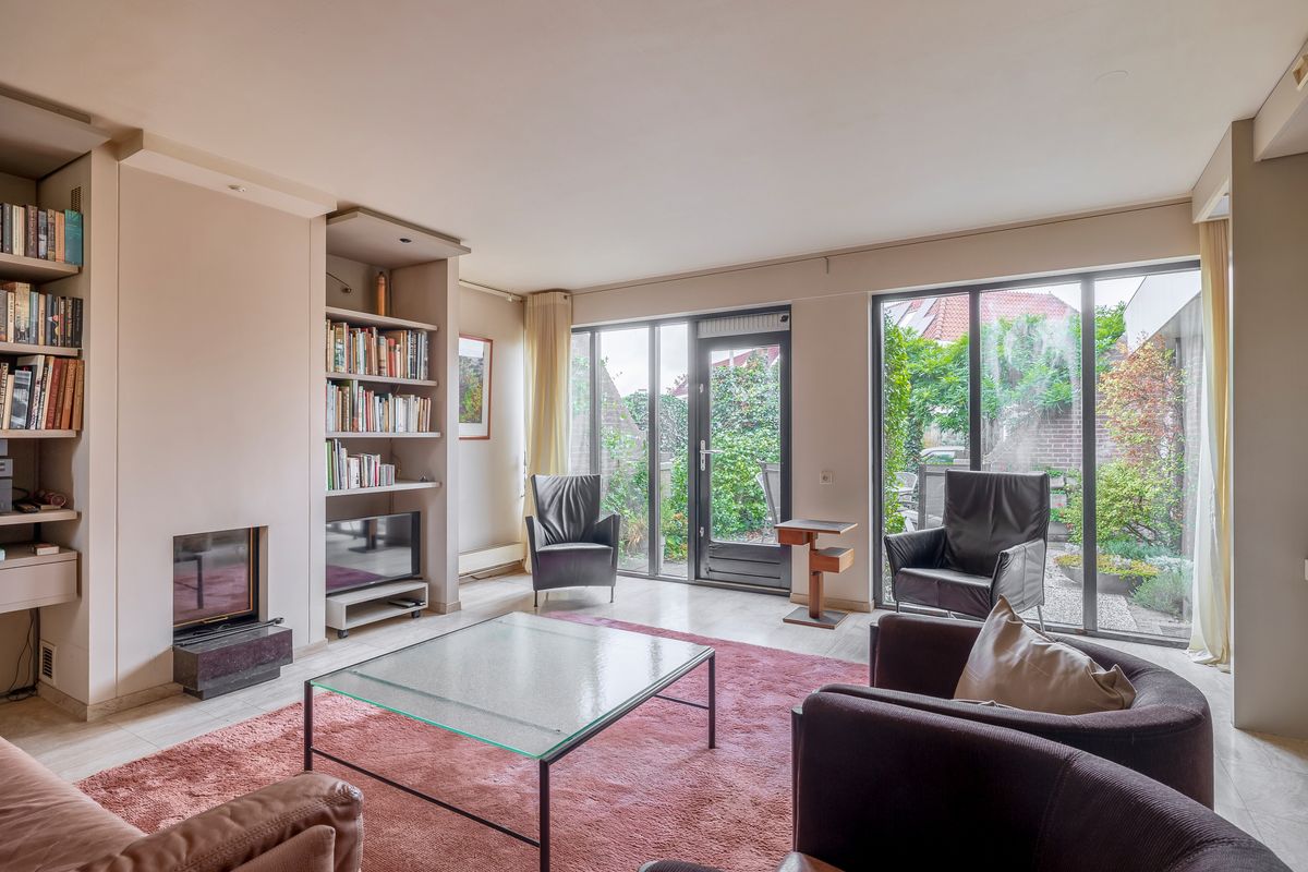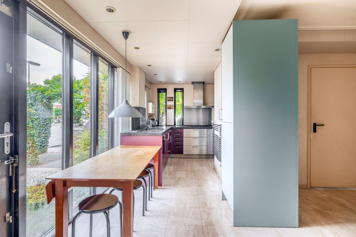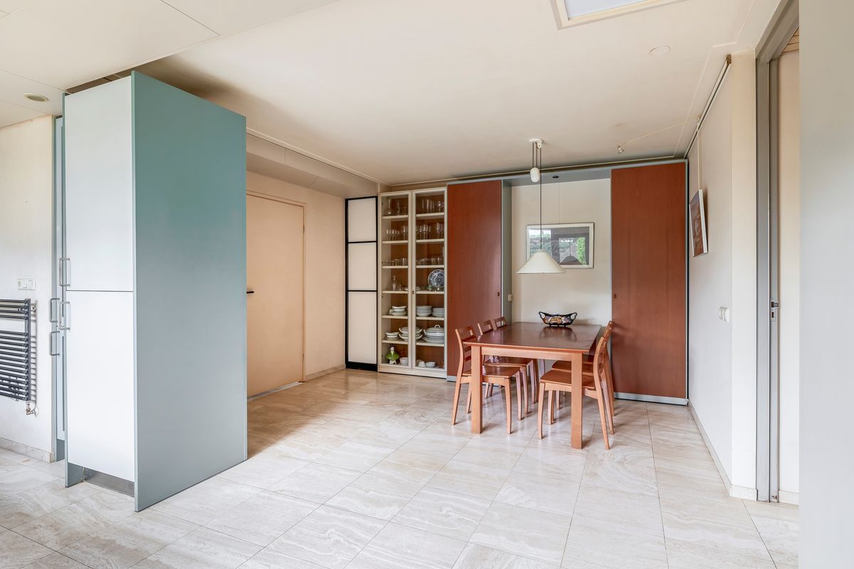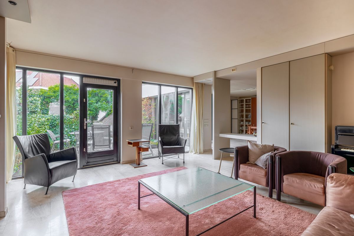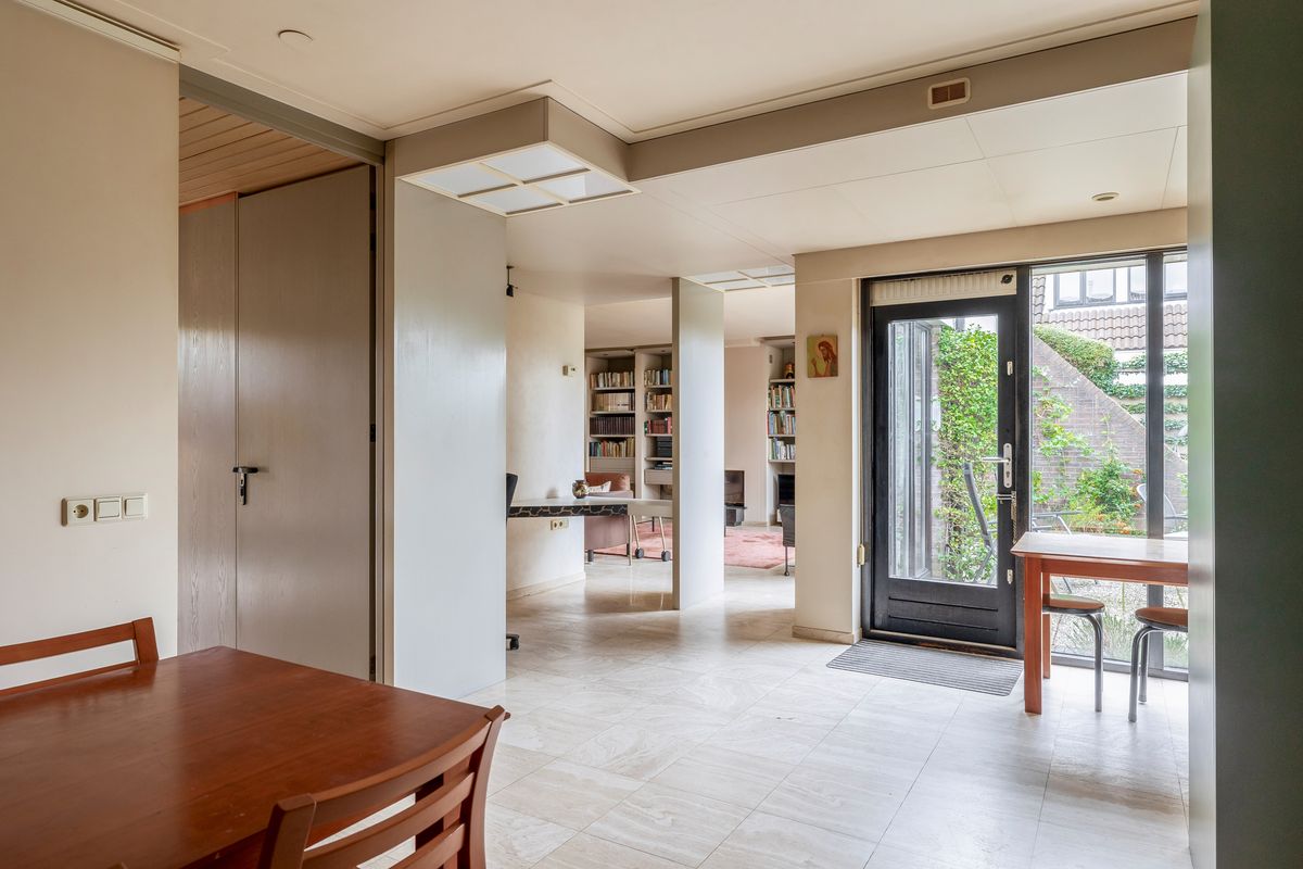 Als je doorloopt kom je in de eetkamer. Direct valt de speelse indeling op en er is heel veel daglicht in het huis. De gehele begane grondverdieping is door een binnenhuisarchitect vormgegeven en zo zijn er op diverse plaatsen inbouwkasten gecreëerd en is het plafond op een aantal plaatsten verlaagd en voorzien van inbouwverlichting. De vloer is afgewerkt met travertin vloertegels en vloerverwarming. In de woonkamer is ook een houthaard aanwezig. De raampartijen lopen door tot op de vloer en zo heb je vanuit de woonkamer, keuken en eetkamer heerlijk zicht op de tuin.
