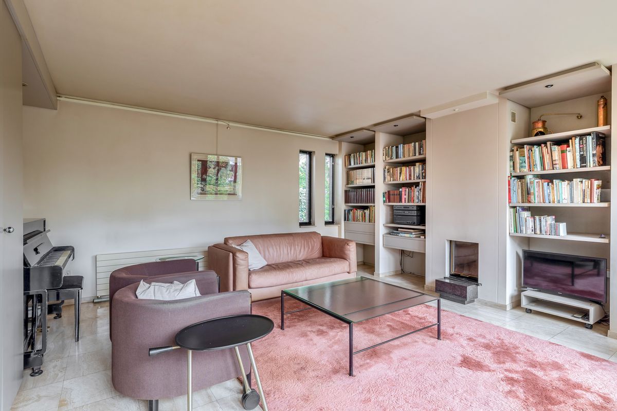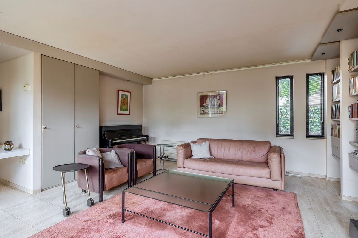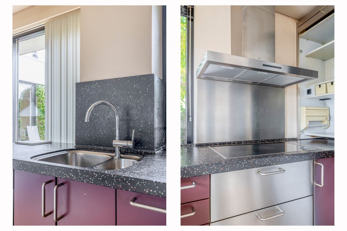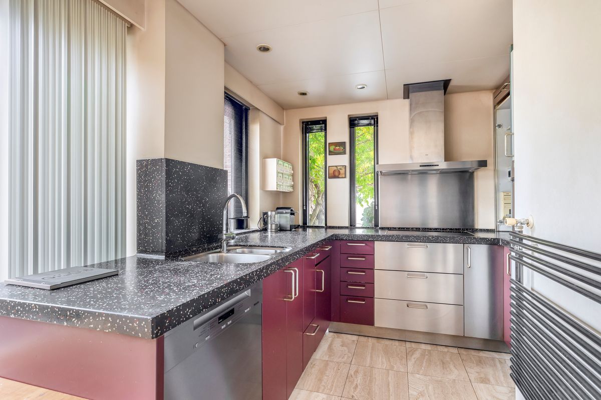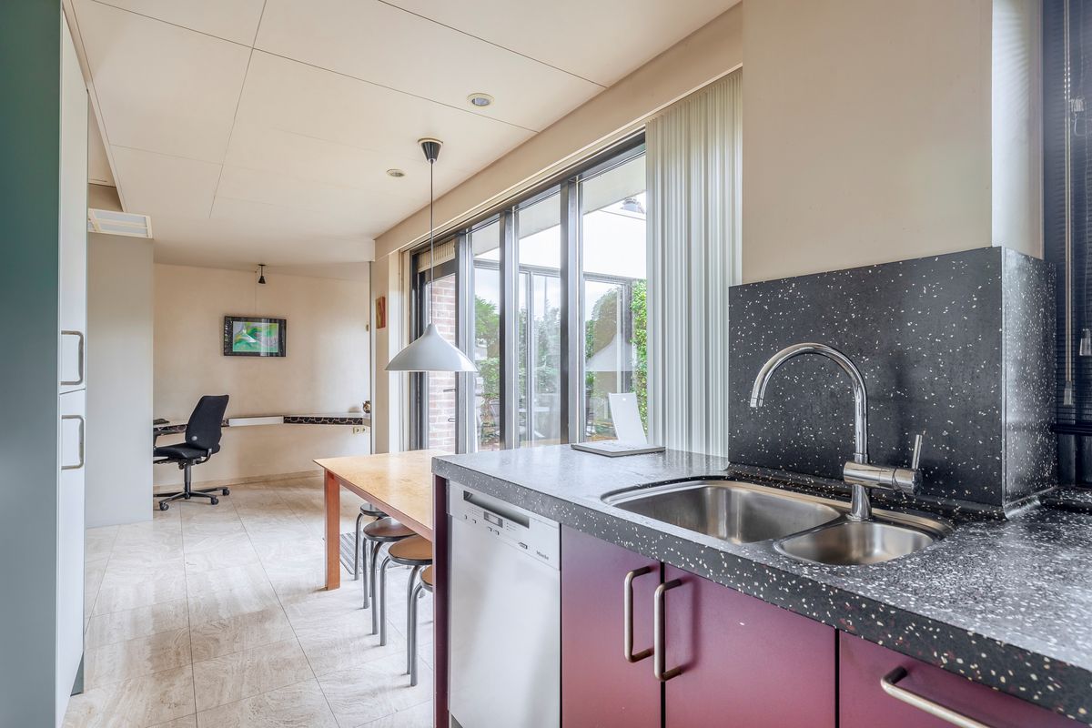 Als je doorloopt kom je in de eetkamer. Direct valt de speelse indeling op en er is heel veel daglicht in het huis. De gehele begane grondverdieping is door een binnenhuisarchitect vormgegeven en zo zijn er op diverse plaatsen inbouwkasten gecreëerd en is het plafond op een aantal plaatsten verlaagd en voorzien van inbouwverlichting. De vloer is afgewerkt met travertin vloertegels en vloerverwarming. In de woonkamer is ook een houthaard aanwezig. De raampartijen lopen door tot op de vloer en zo heb je vanuit de woonkamer, keuken en eetkamer heerlijk zicht op de tuin.