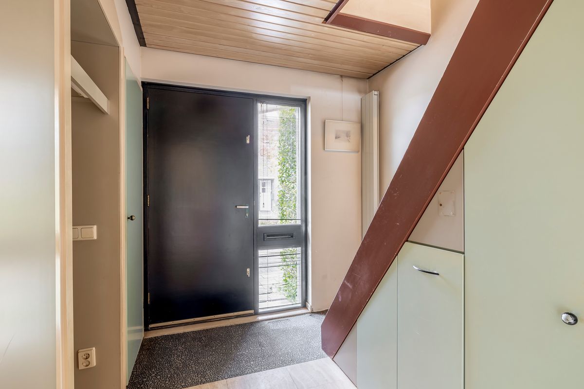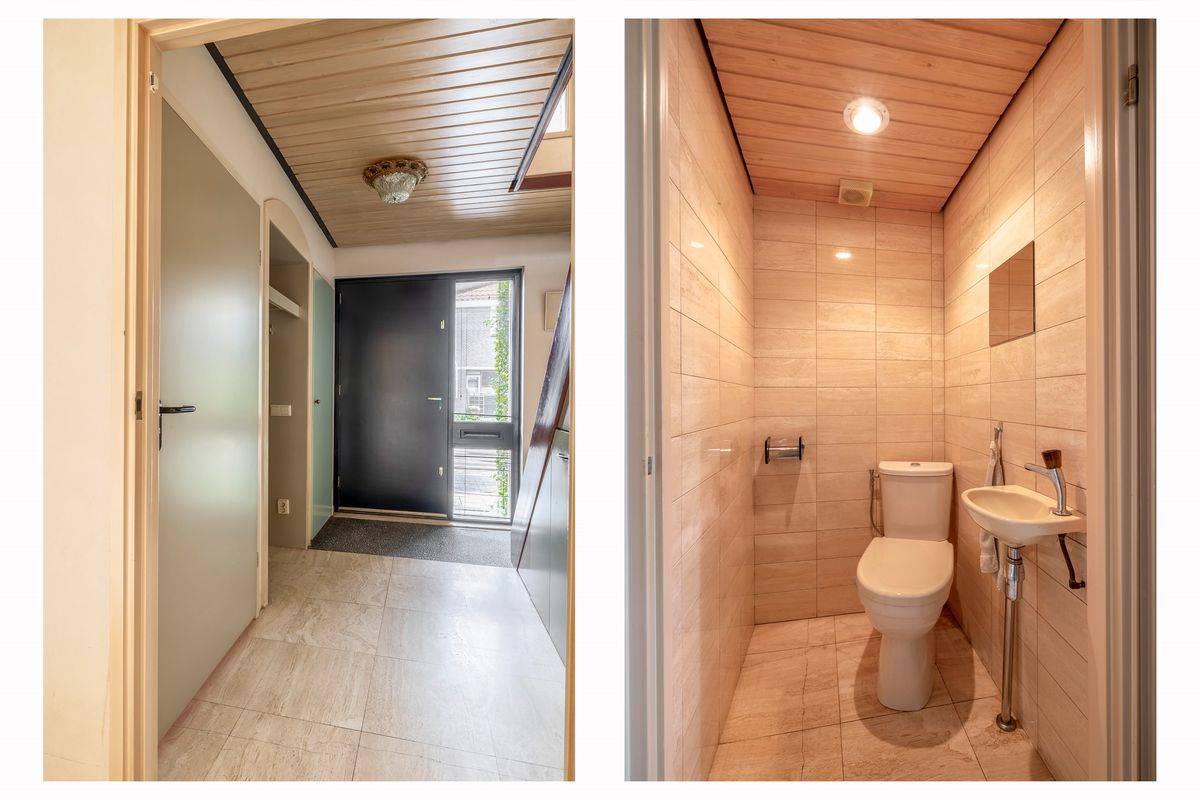 Via de voordeur kom je binnen in een royale hal. Hier is links de trapopgang naar de eerste verdieping. Rechts bevindt zich de meterkast, er is een garderobe nis en vervolgens de toiletruimte. Onder de trap is nog veel opbergruimte beschikbaar.