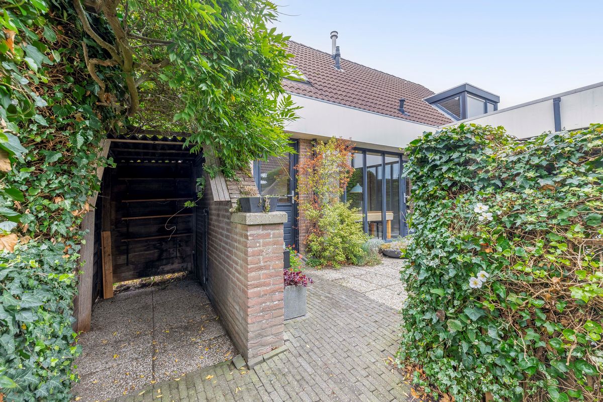De andere tuin is toegankelijk vanuit de woonkamer en de eetkamer. Deze is grotendeels voorzien van bestrating. Langs de rand van de tuin staan muren en beplanting en de wijze van begroeiing langs een pergola zorgt ook hier voor veel beschutting en privacy. Vooraan de tuin is een houten open berging met elektra aanwezig, een prima plek voor fietsen. In deze tuin is ook een buitenkraan aanwezig.