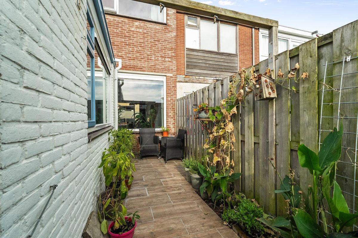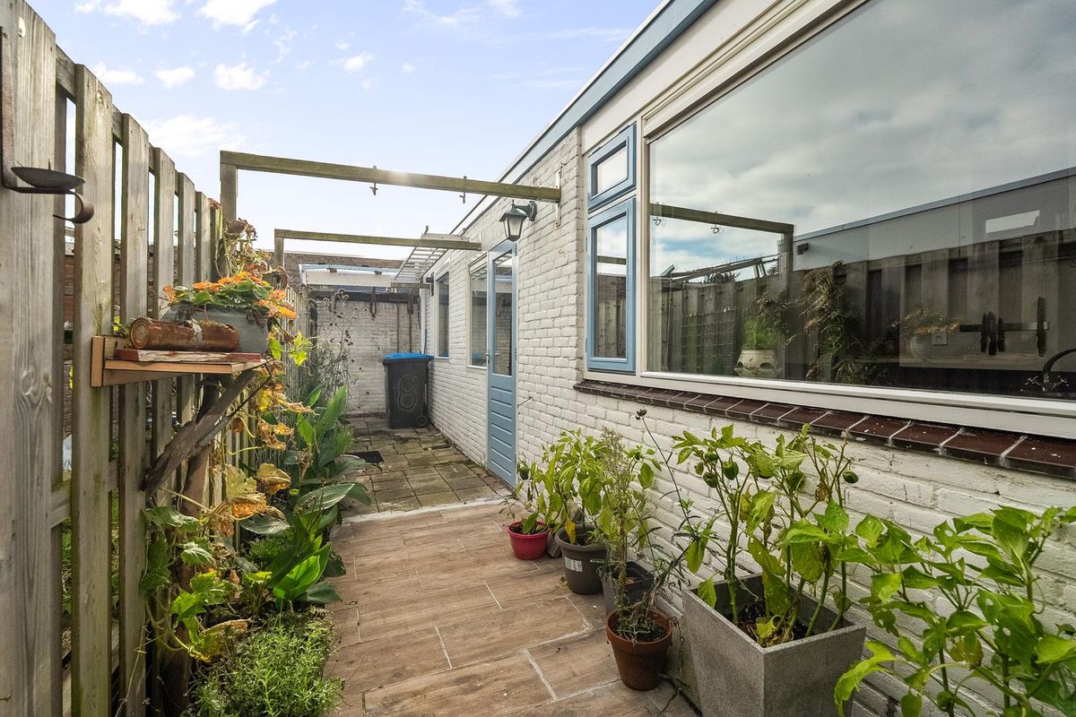 De zonnige achtertuin biedt volop privacy en heeft een achterom, ideaal voor fietsen of een snelle route naar buiten. Hier geniet je van het buitenleven, of je nu wilt ontspannen met een boek of gezellig wilt borrelen met vrienden.