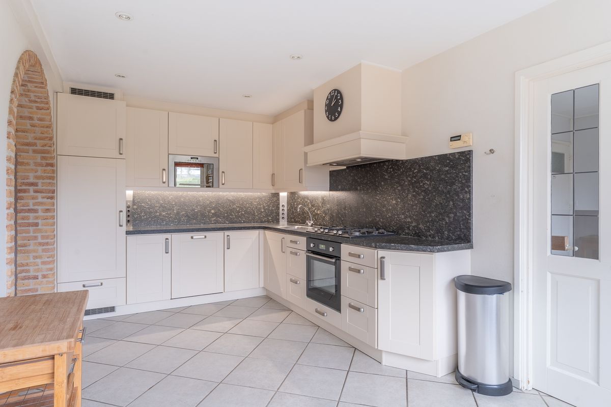 De royale woonkeuken is geplaatst in een hoekopstelling en voorzien van diverse inbouwapparatuur. De toog naar de woonkamer zorgt voor een sfeervolle verbinding. In de woonkamer geven openslaande deuren toegang tot de overkapping en het perceel.