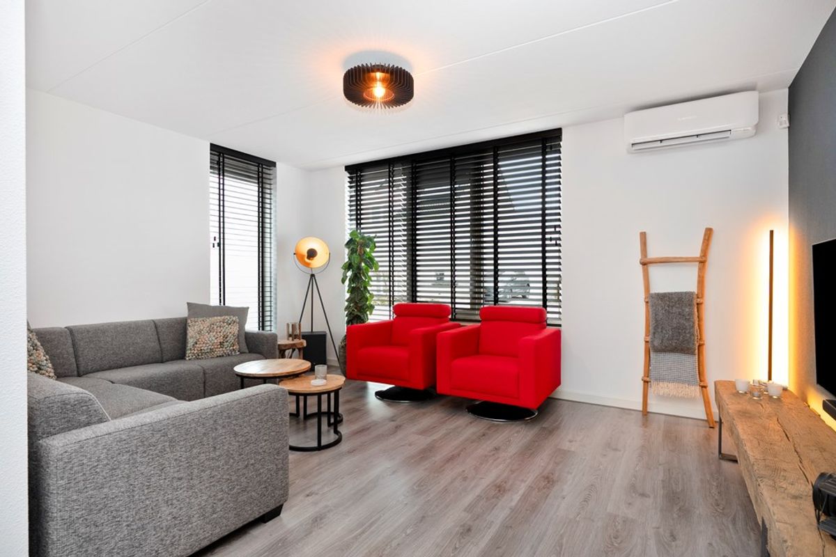 Over de gehele begane grond ligt een laminaatvloer. In de woonkamer hangt een split-unit airco/warmtepomp (2021), waarmee je in elk seizoen de temperatuur eenvoudig regelt.
